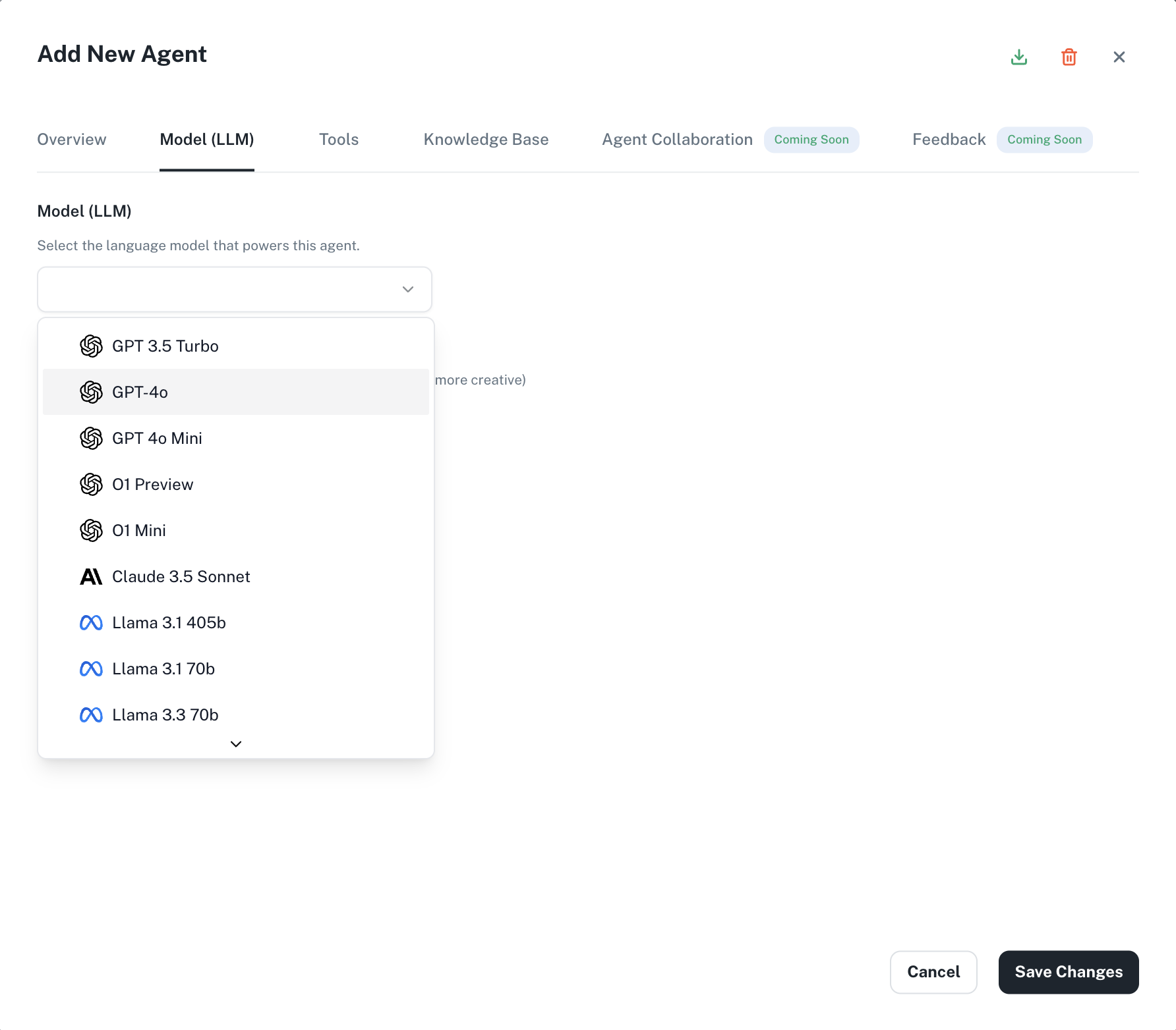 Model is the LLM that will drive your agent. Choose your desired model from the dropdown.For this case, let’s choose GPT-4o.