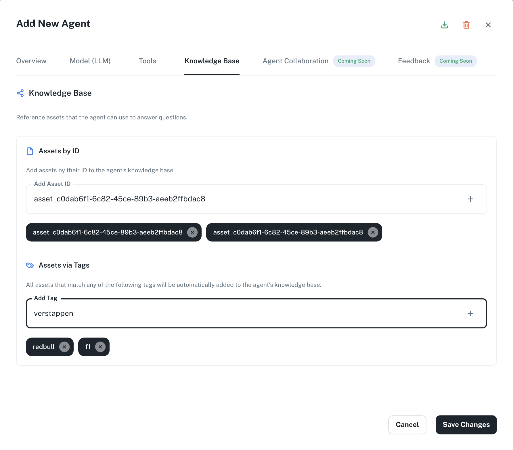 @your-asset-name or drag and drop files from your local System.For this case, you need not add any assets to the knowledge base, but for illustration this is how you can add assets from your workspace in your agent’s knowledge base.