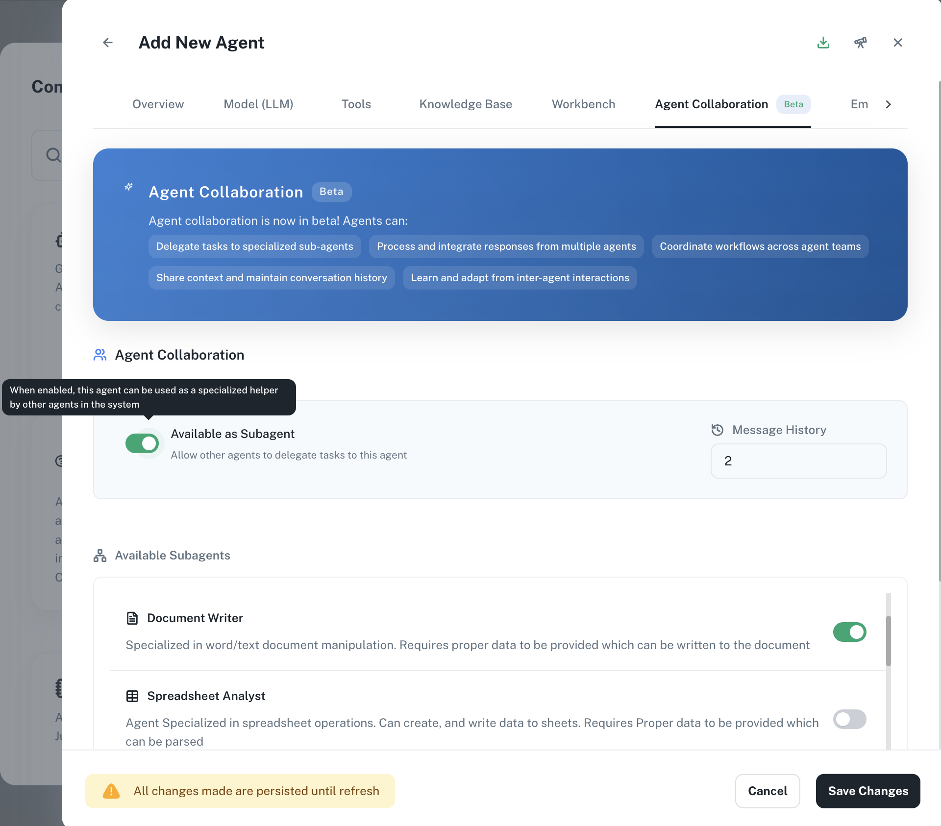 Agent collaboration enables agents to delegate tasks to specialized sub-agents, process and integrate responses from multiple agents, and coordinate complex workflows across teams. Additionally, agents are capable of sharing context, maintaining conversation history, and learning from interactions with other agents.You can also choose if your agent should be available as a sub-agent to other agents by toggling the Available as Subagent button.For this example, select the Document Writer as a sub-agent.