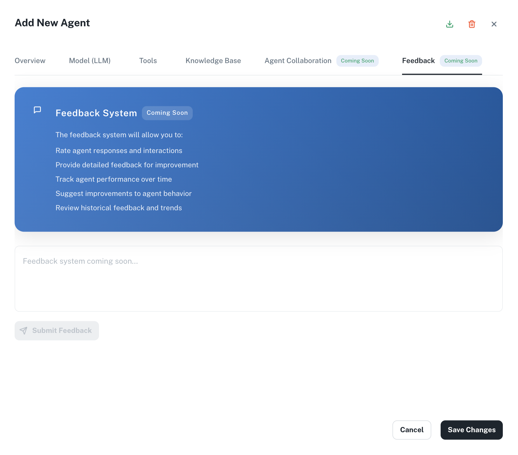 The feedback system will enable you to rate agent responses and interactions, provide detailed feedback for improvement, and track agent performance over time. It will also allow you to suggest improvements to agent behavior and review historical feedback and trends.