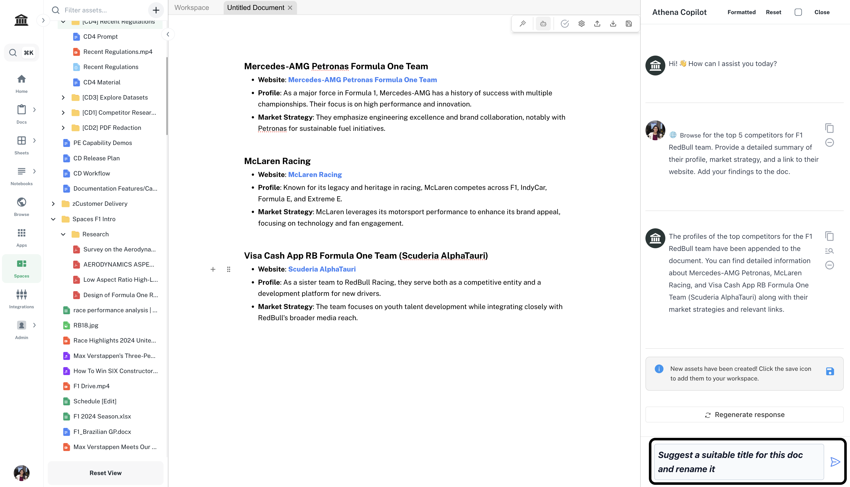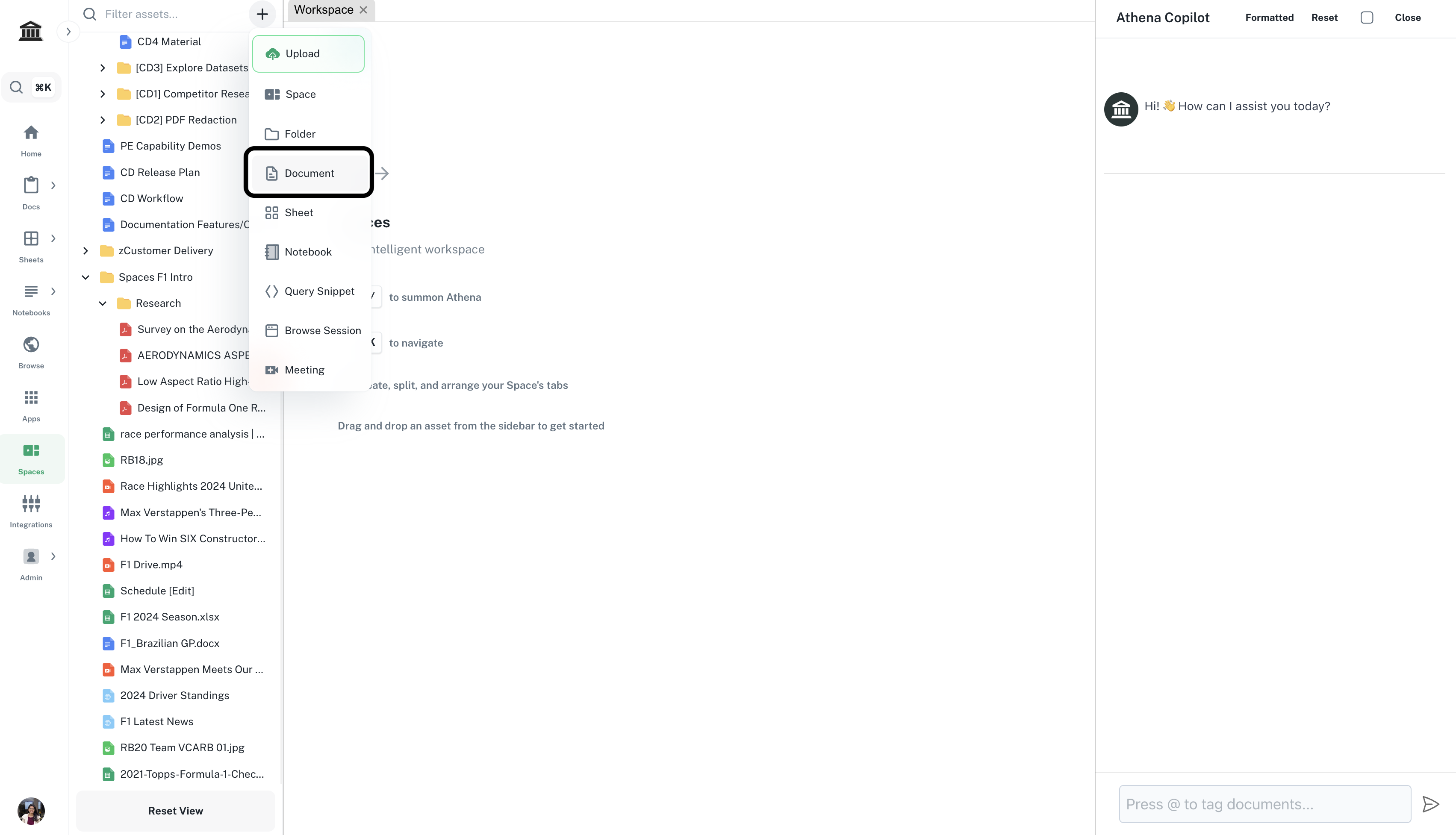 Navigate to Spaces. Click on ’+’ -> Document from the top-right corner of the assets menu.