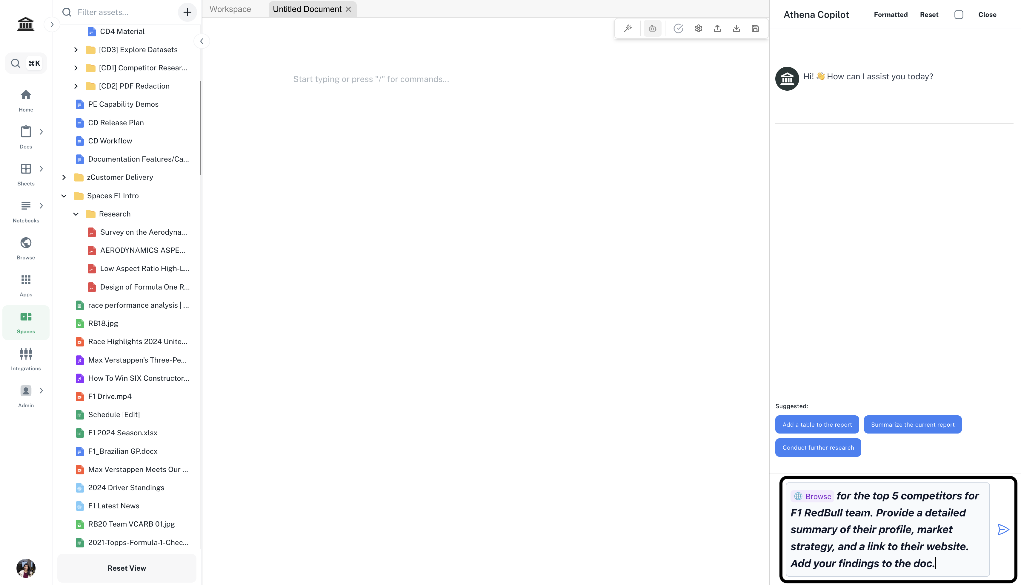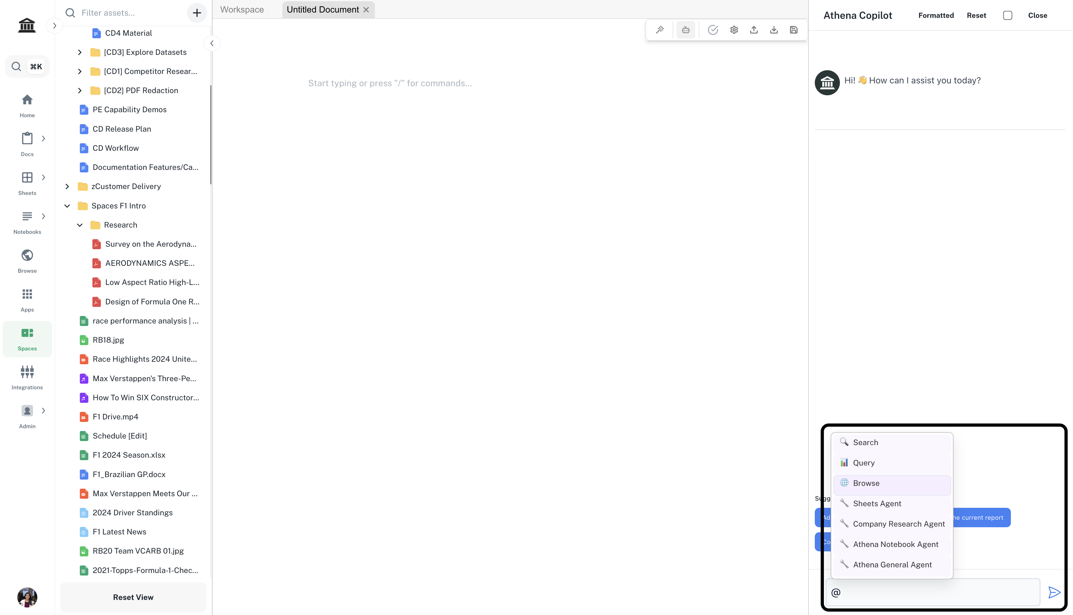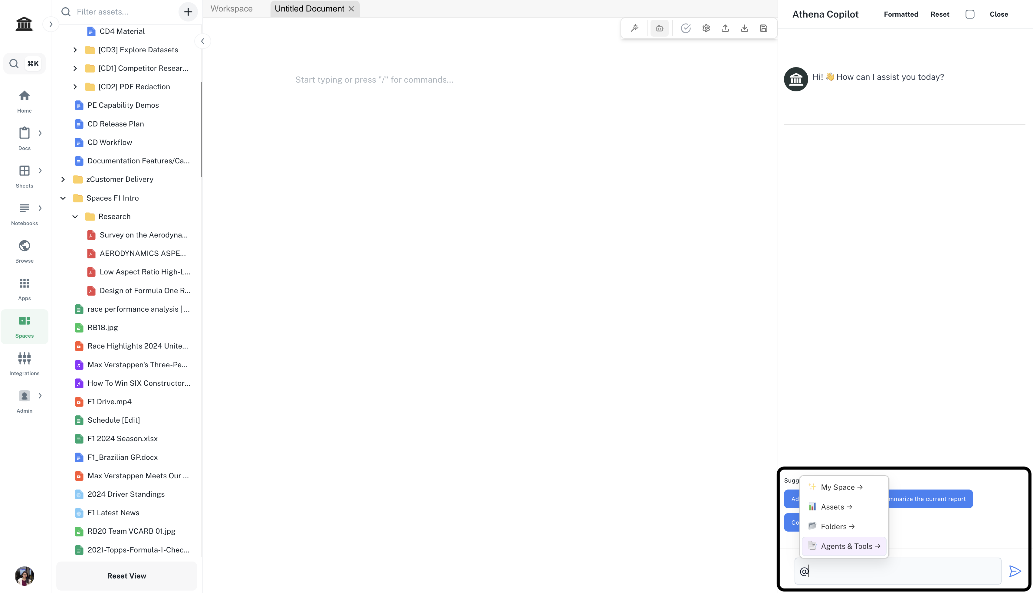 In the Athena Copilot open by default on the right, type ’@’ and select Agents & Tools -> Browse from the dropdown.