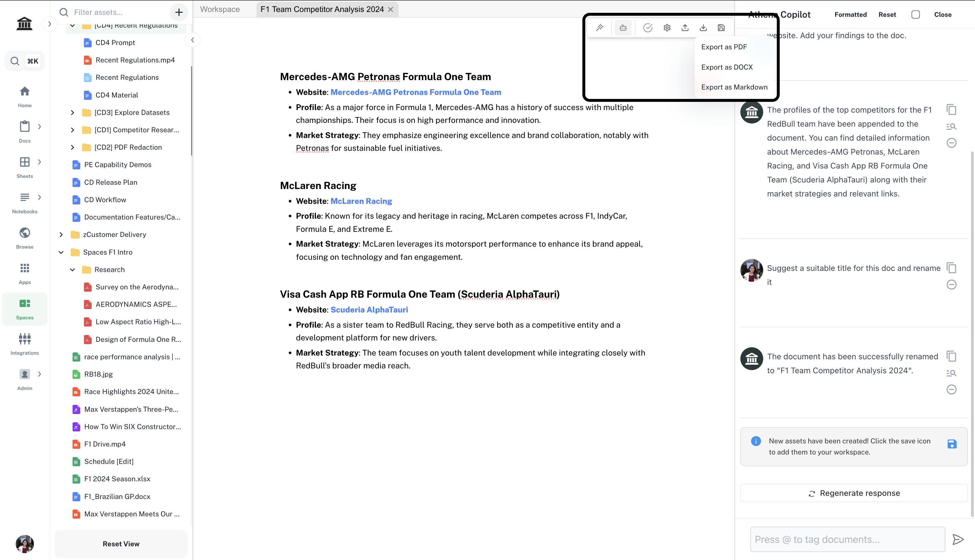 Click on the Download icon from the top-right menu. Download your file as a PDF, Document or a Markdown file.