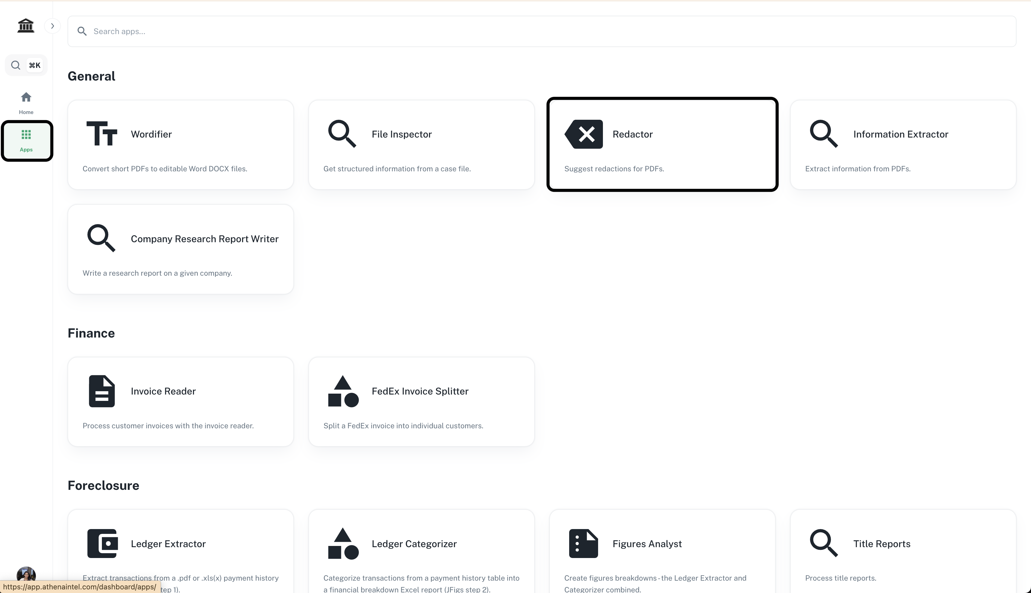 Navigate to Apps -> Redactor from the applications sidebar on the left.