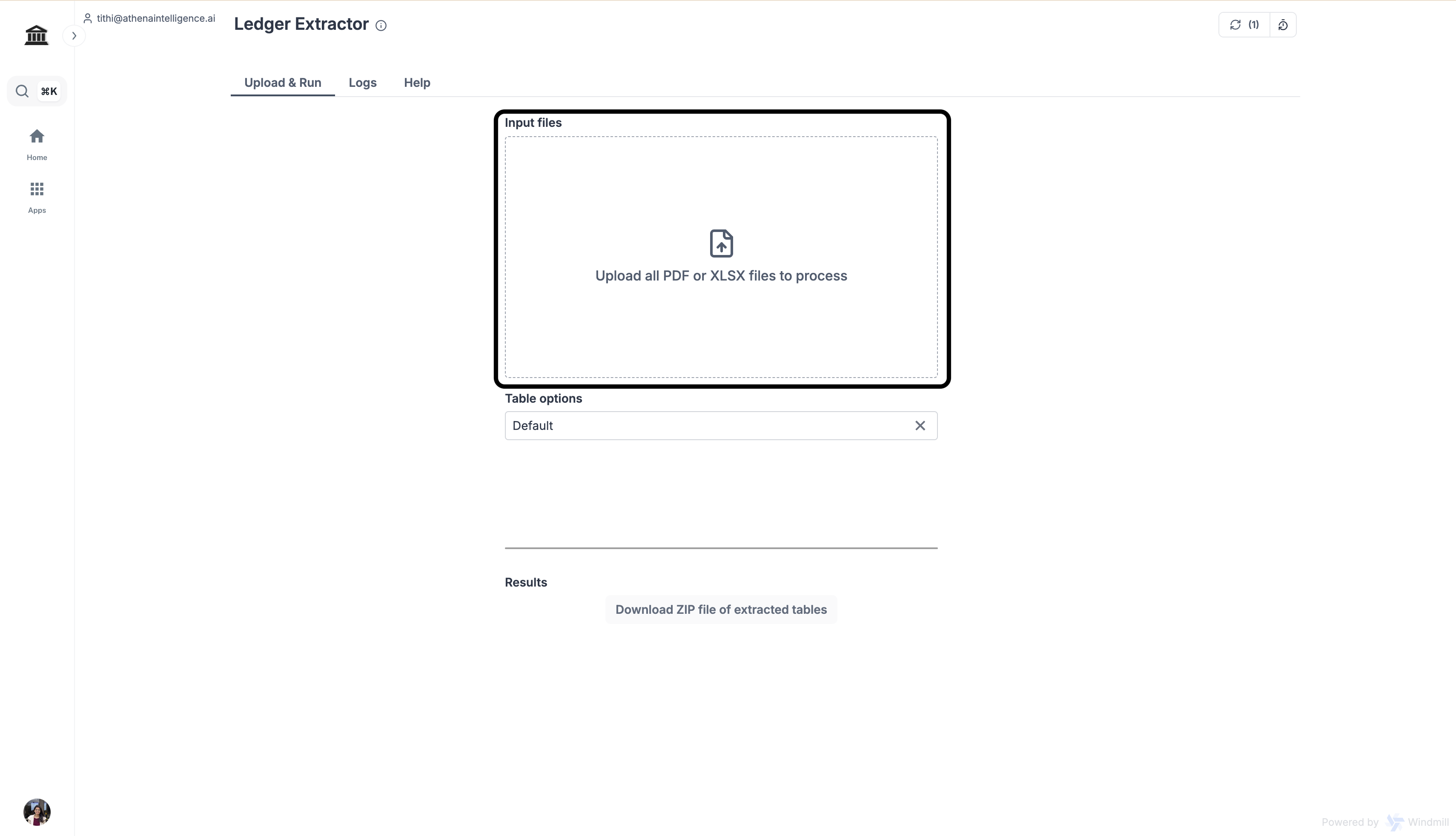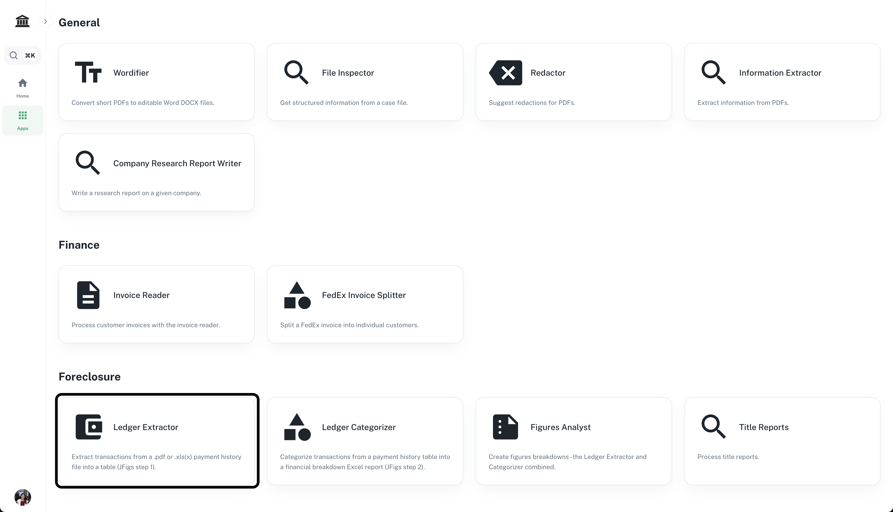 Navigate to Apps -> Ledger Extractor from the applications sidebar on the left.
