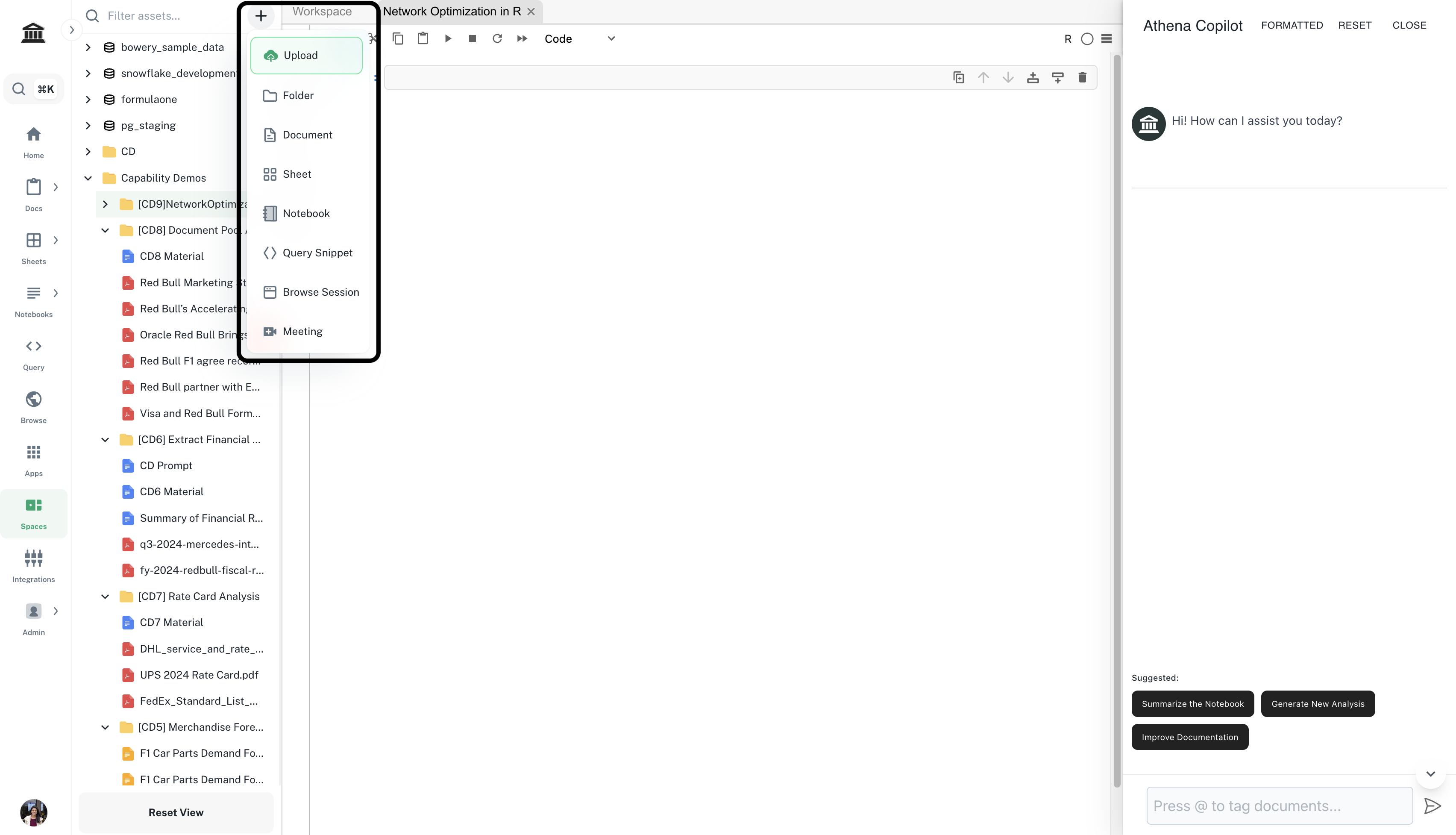 Upload the required datasets as Athena assets by clicking on ’+’ icon -> Upload.