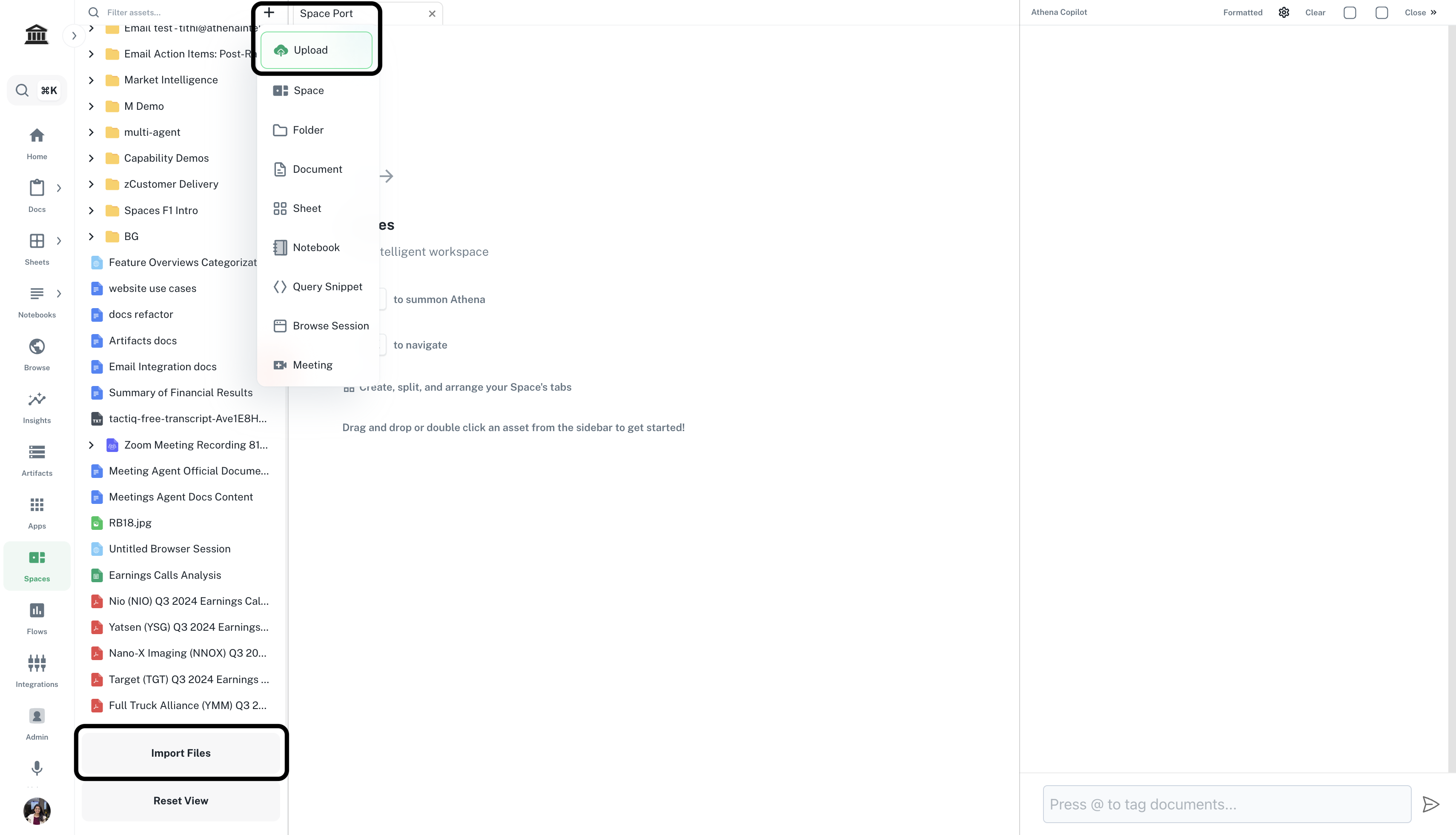 Athena Spaces is a dynamic workspace that transforms the way you interact with multiple assets simultaneously. This innovative workspace empowers you to create, organize, and manipulate your work environment with unprecedented flexibility and efficiency. With Spaces, you can effortlessly drag-and-drop various components, creating a personalized, adaptive workspace that suits your unique workflow. Spaces is not just another application—it’s the central nervous system of your Athena experience, integrating seamlessly with all 19+ applications, your data sources, and Athena’s AI capabilities.Check out Athena’s visibility and capabilities for Spaces here!
