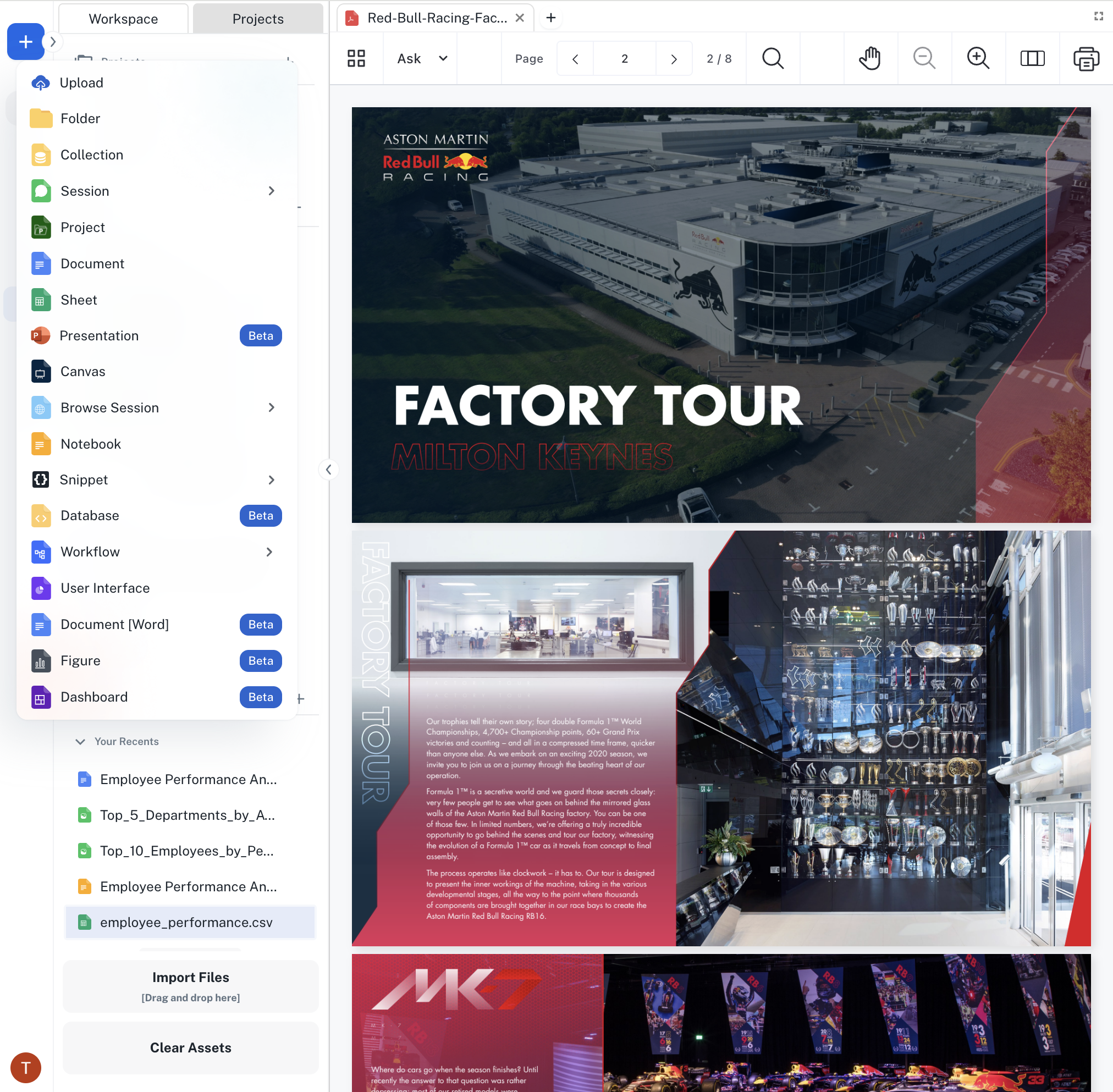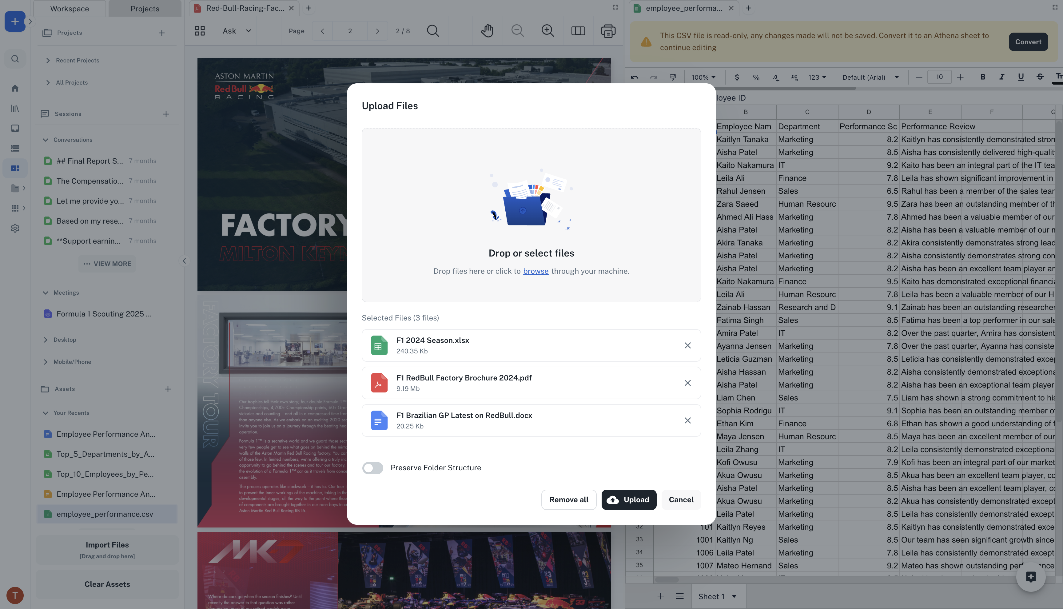 Easily add your data to Athena by importing various assets including PDFs, documents, spreadsheets (Excel/CSV), and media files (video/audio), etc. through our simple upload interface.Athena supports the following assets: