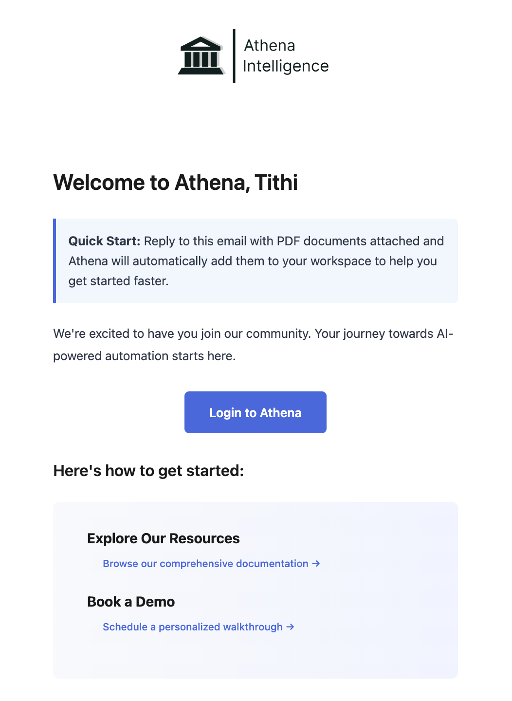 Request account access by writing an email to [email protected]. You will get a Welcome email from Athena. Once you confirm your email and set your password, you should be all set.