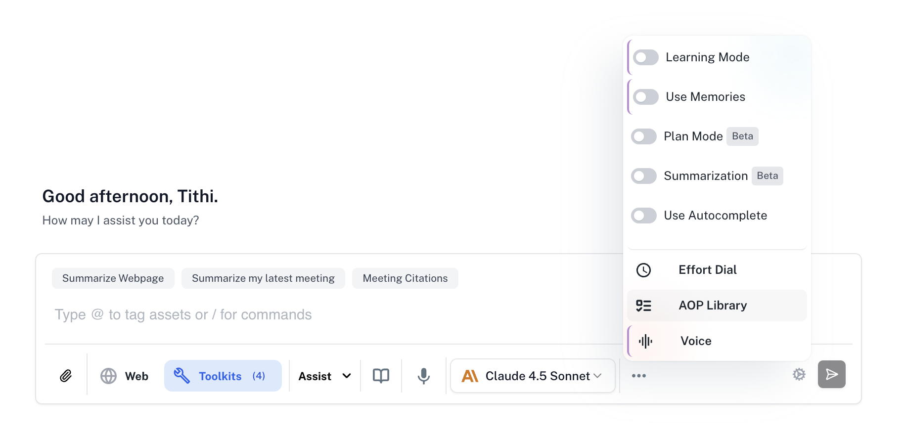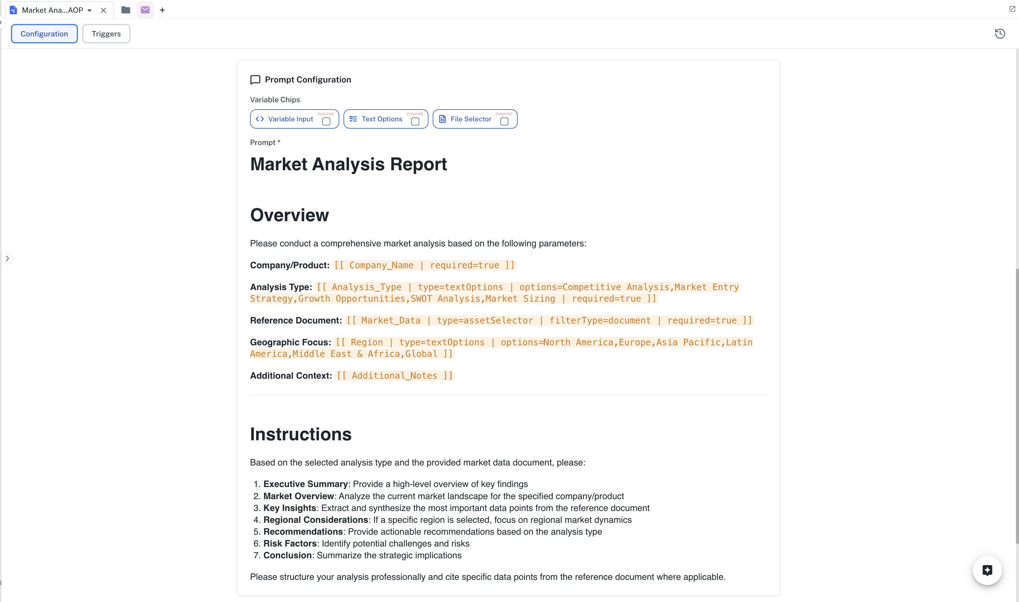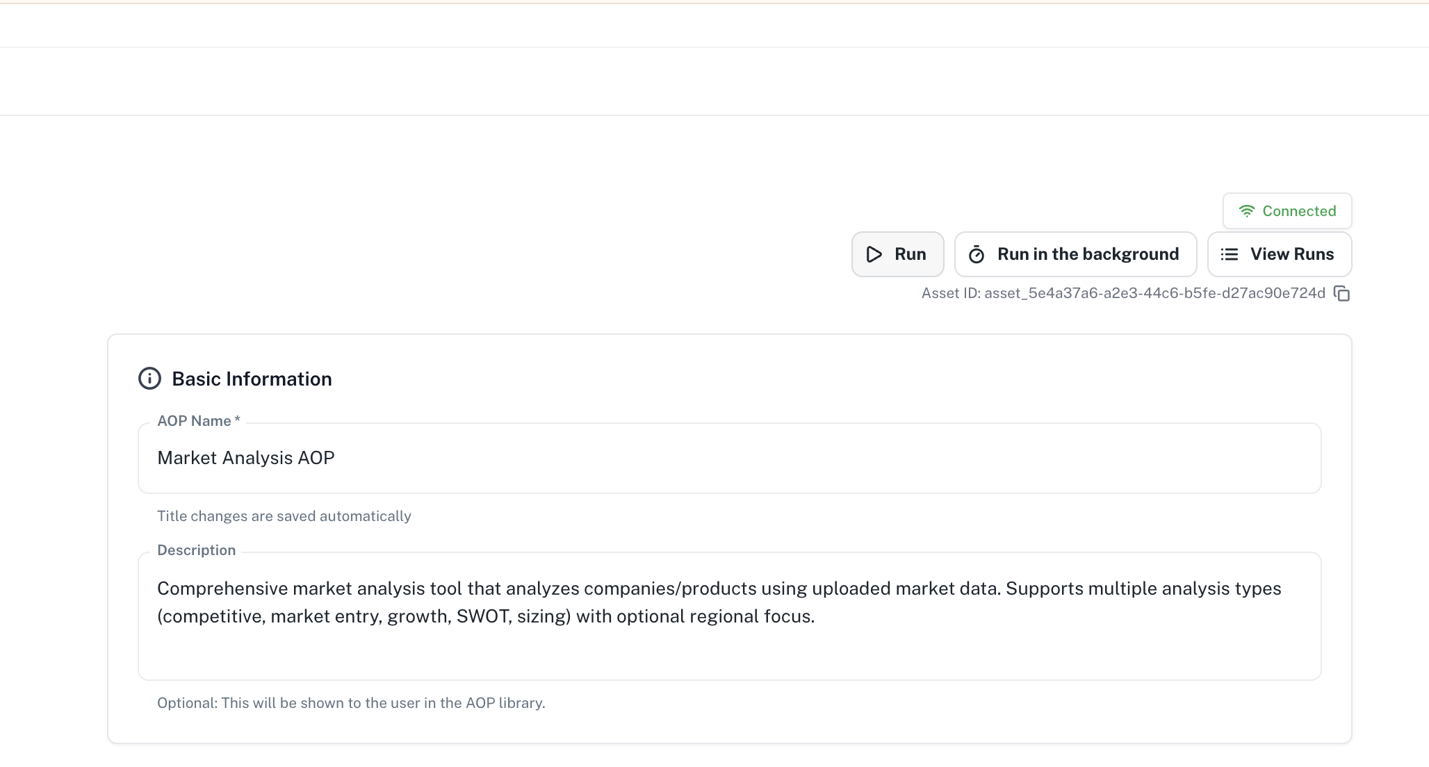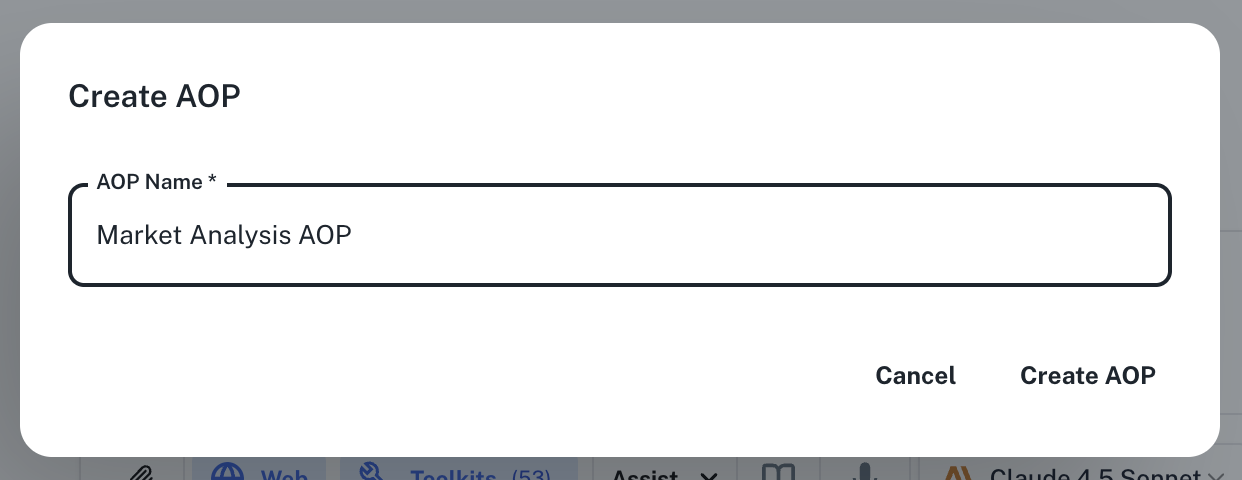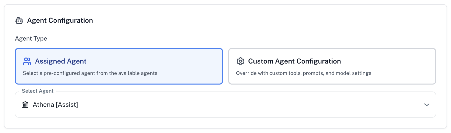 Configure AOPs with specific agent personas, model selections, and tool access permissions. Customize how AOPs execute by selecting the appropriate AI model, defining the agent’s capabilities, and setting execution parameters to match your specific use case requirements.You can choose between using a pre-configured agent from your available agents or creating a custom agent configuration that overrides the default settings with custom tools, prompts, and model selections.