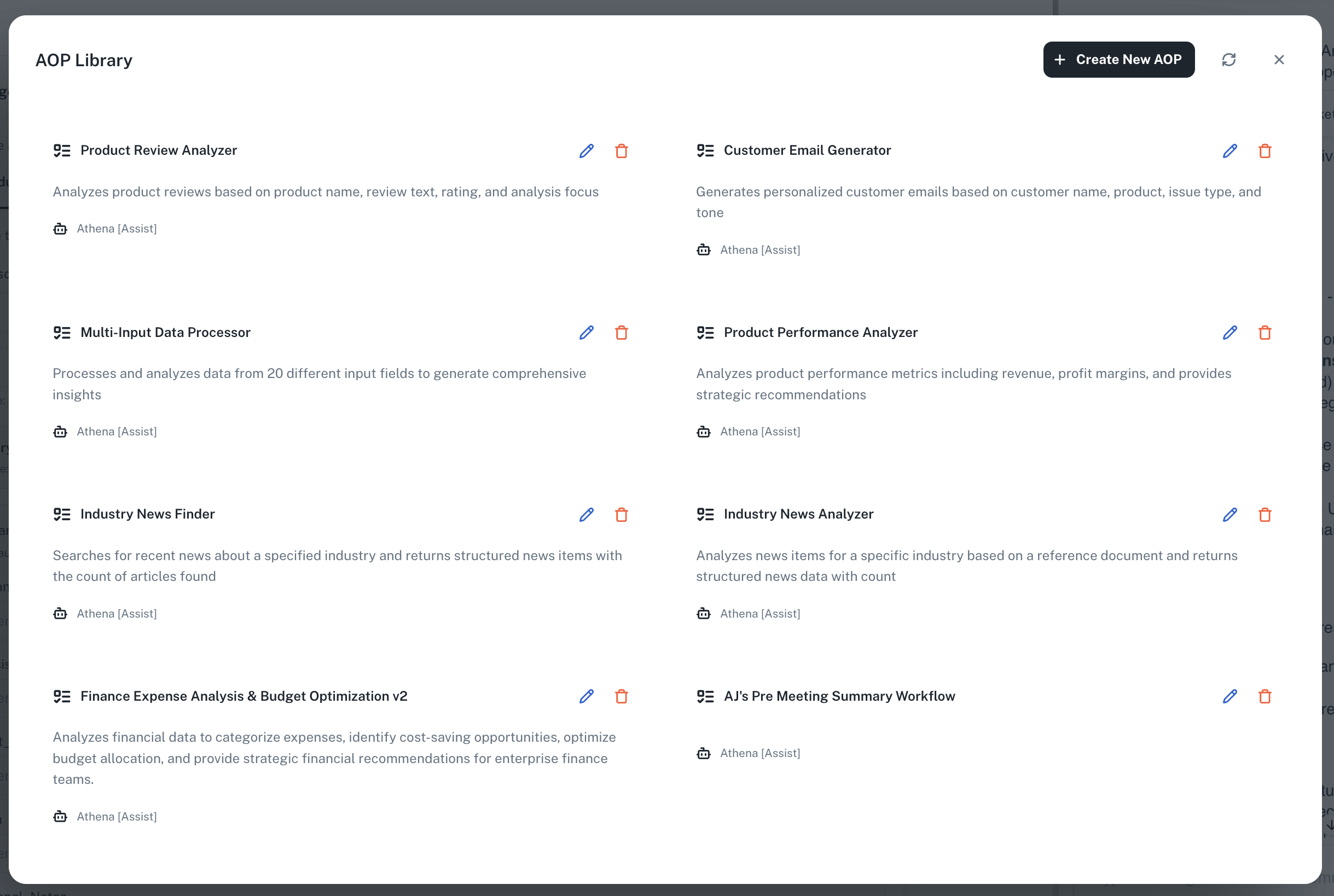 AOPs can be executed directly on spreadsheet data, enabling automated data processing workflows. Use AOPs to analyze datasets, generate insights, create reports, or perform complex calculations on your Athena Sheets without manual intervention.User Interface Integration