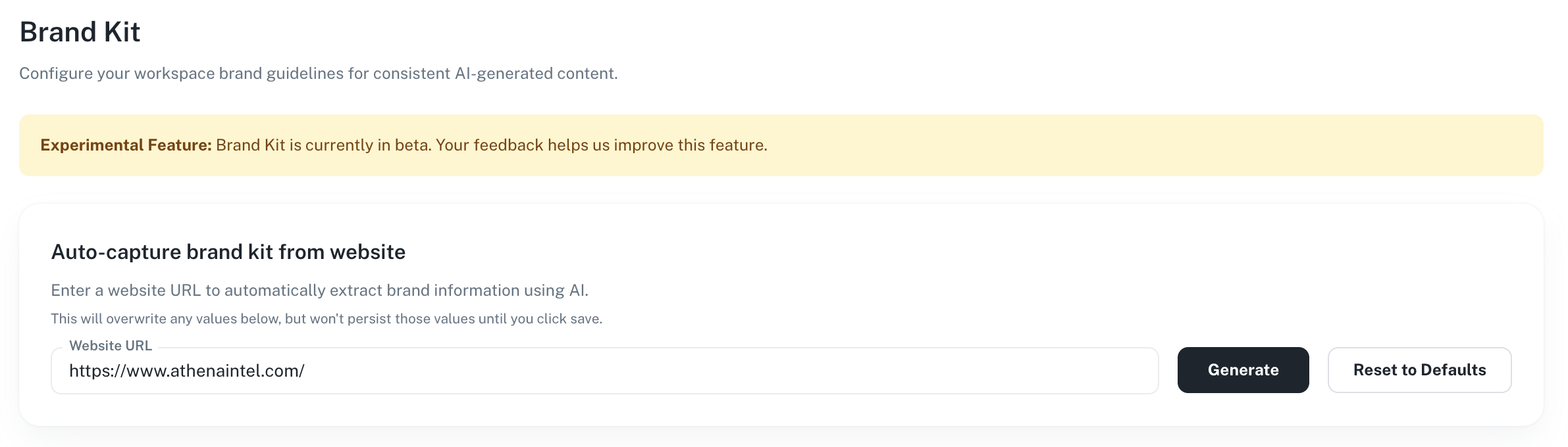 Automatically extract brand information from any website URL using AI. Simply enter your company’s website URL, and Athena will analyze the page to extract colors, fonts, and other brand elements, saving you time on manual configuration.