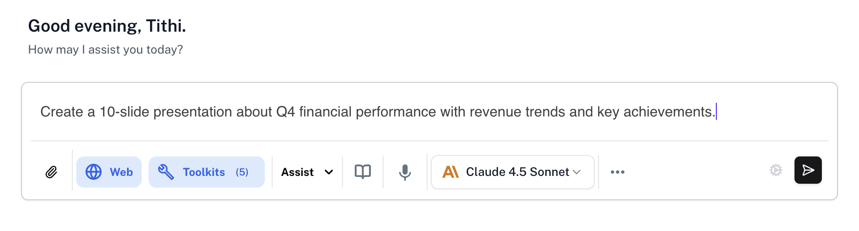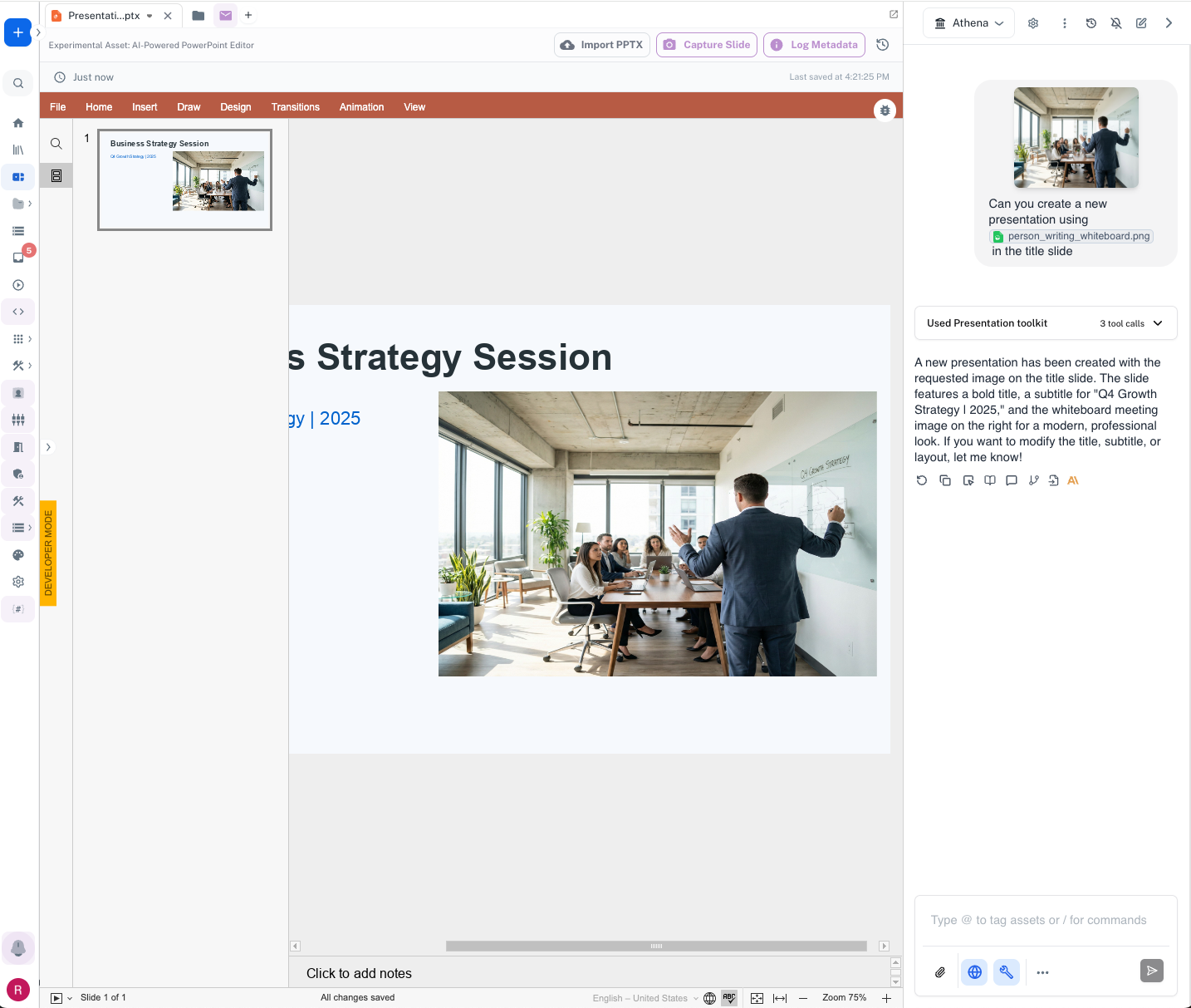 Use natural language to describe your presentation needs, and Athena will generate complete slide decks or individual slides. Request modifications and refinements through simple conversational instructions.