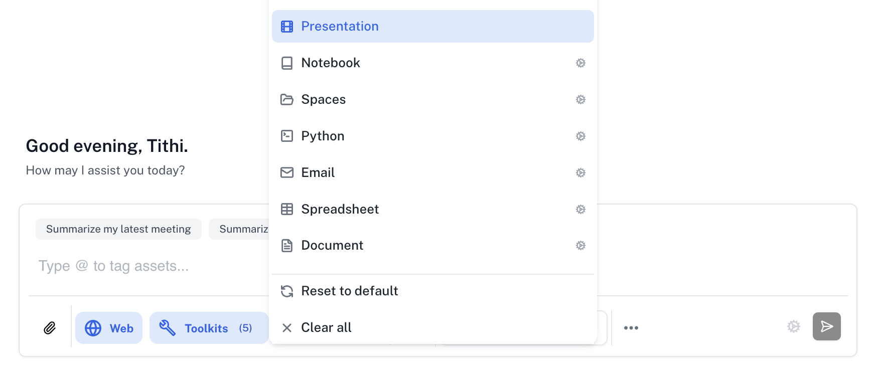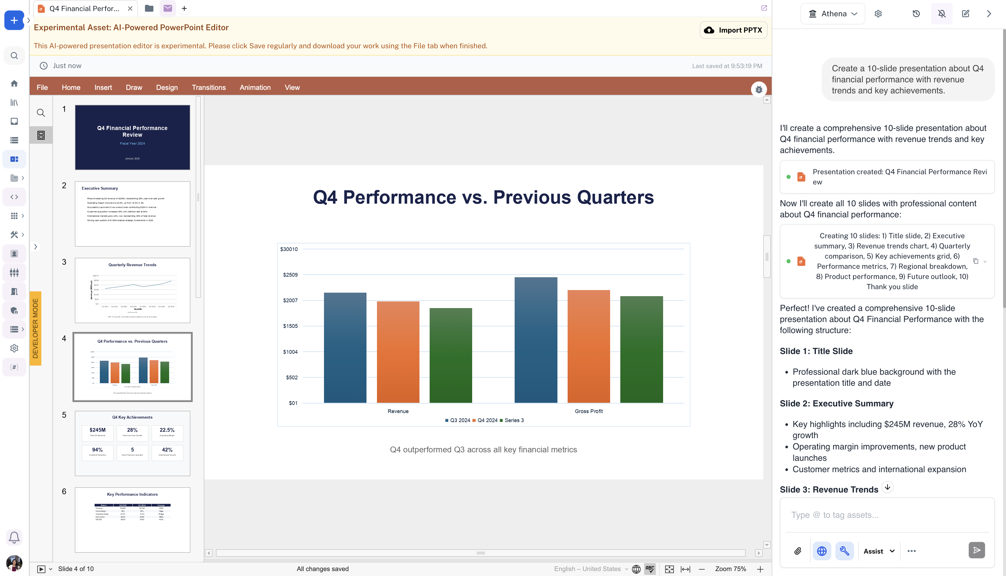 Athena Presentations enable you to create professional, AI-driven slide decks that seamlessly integrate data visualizations, charts, and compelling narratives. Transform your data and ideas into polished presentations that captivate your audience.Using Presentations, you can generate entire slide decks, customize individual slides, and incorporate dynamic visual elements—all through natural language interactions with Athena.