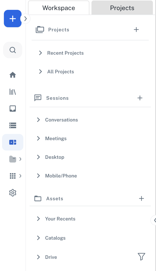 The workspace structure on the left side of your Spaces view provides a comprehensive framework for managing your professional activities and information resources. This sidebar is your primary navigation tool, giving you instant access to all your work.