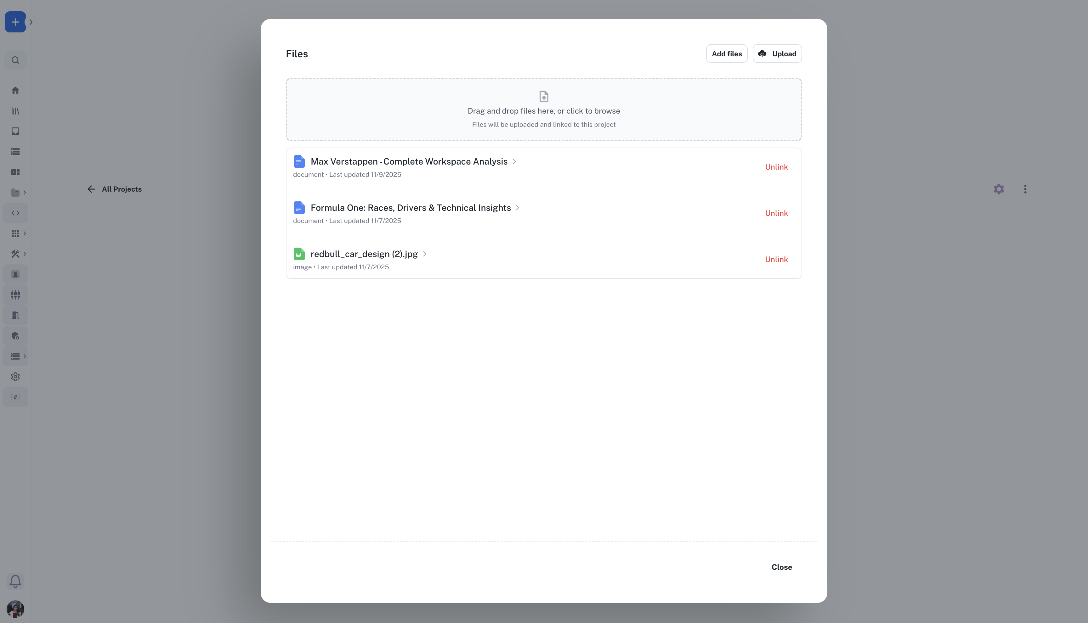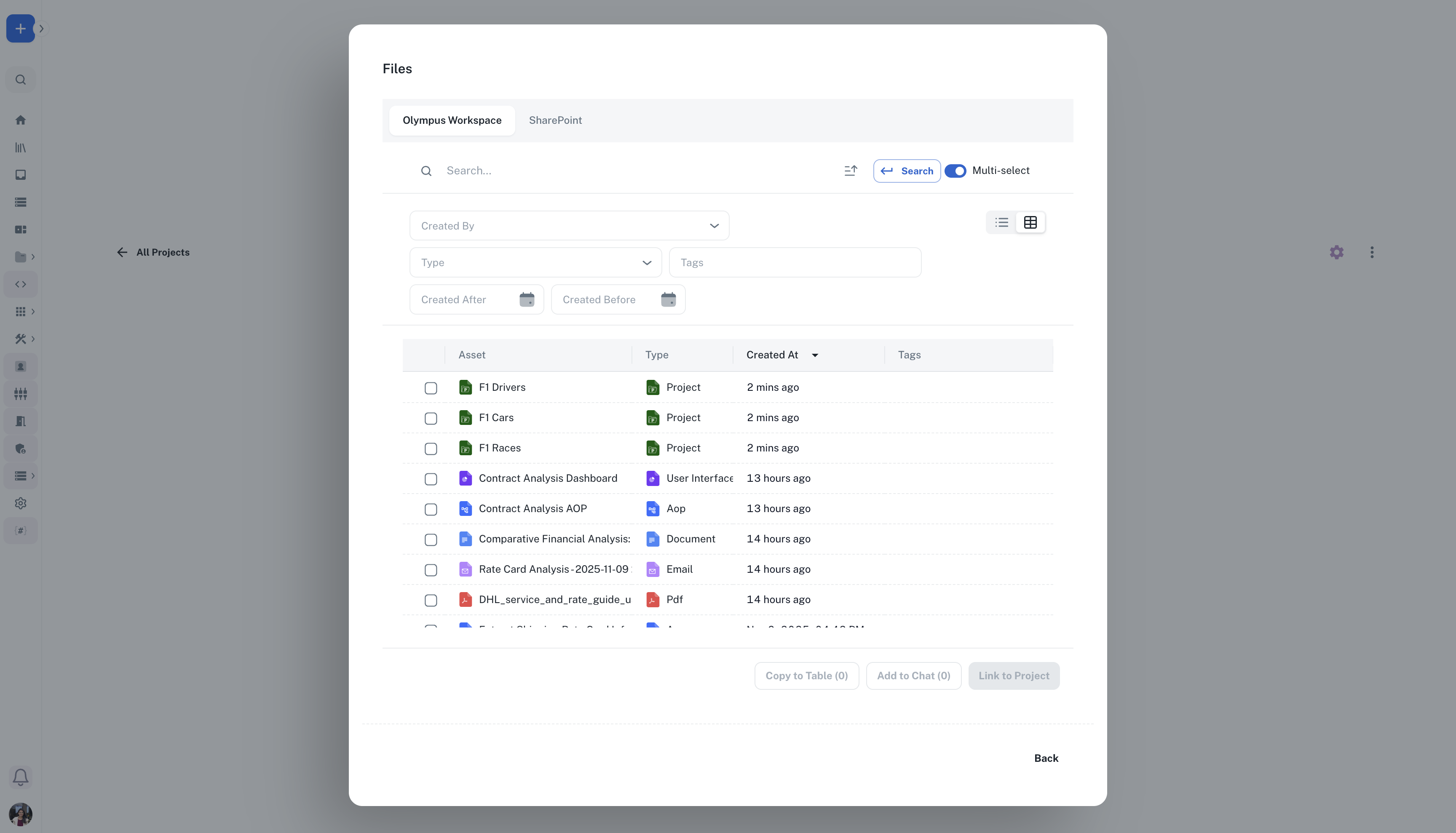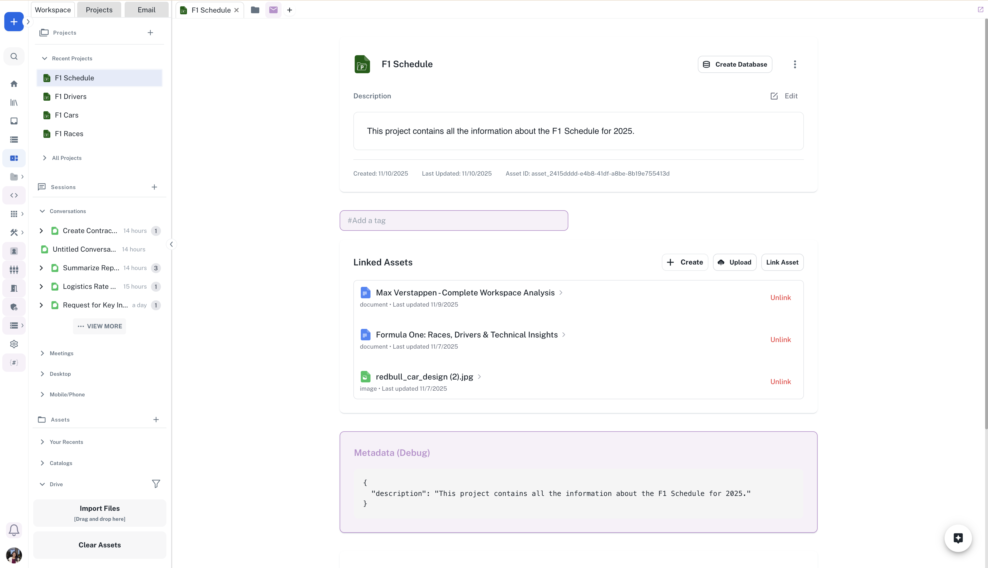 - Add Assets from Workspace: Add existing documents, spreadsheets, or other assets within the project context from your workspace.