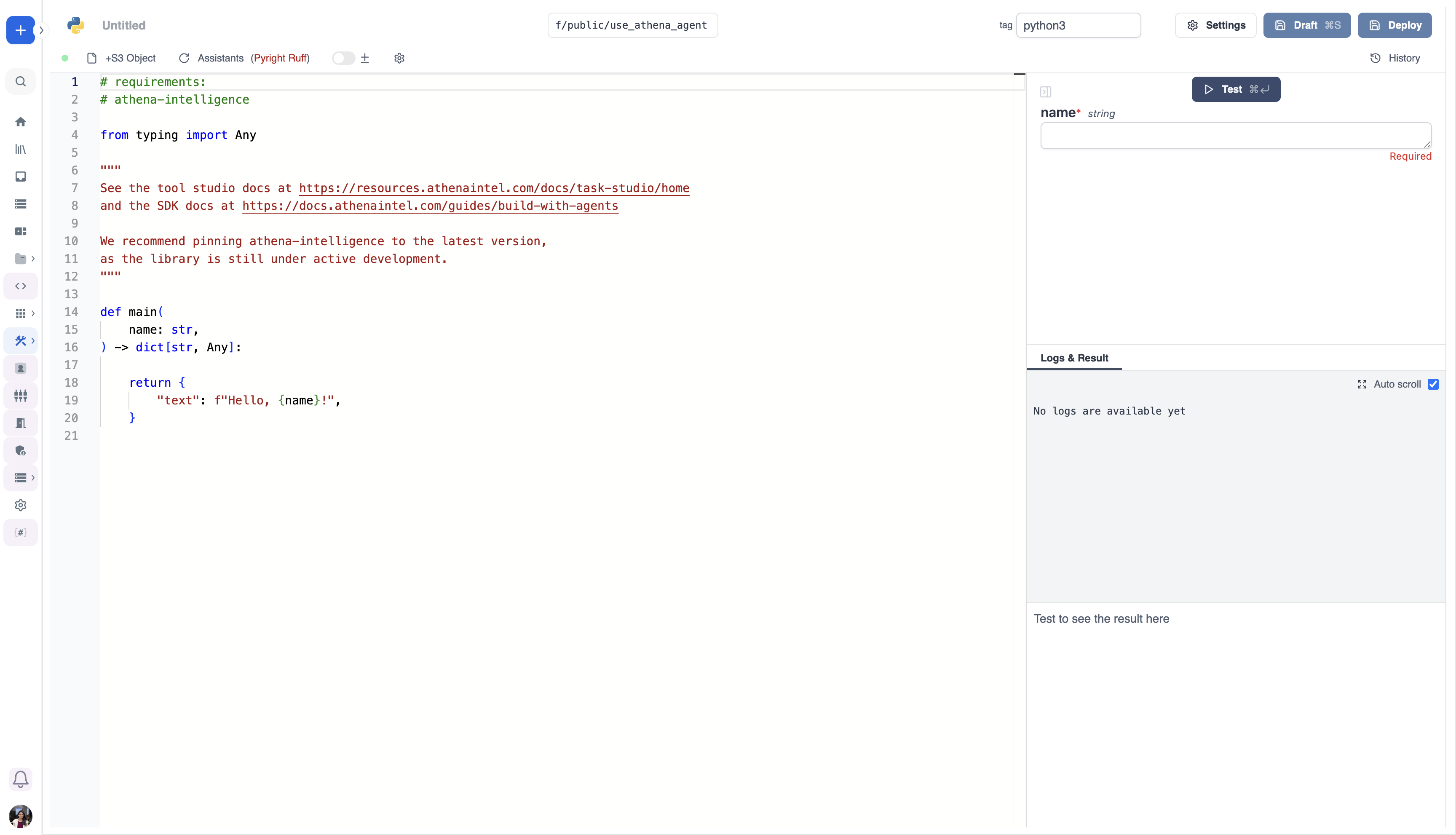 This guide is designed for technical users with basic coding skills, enabling them to effectively harness the full Python ecosystem for custom data integration and seamless access to Athena agents through Athena SDK.