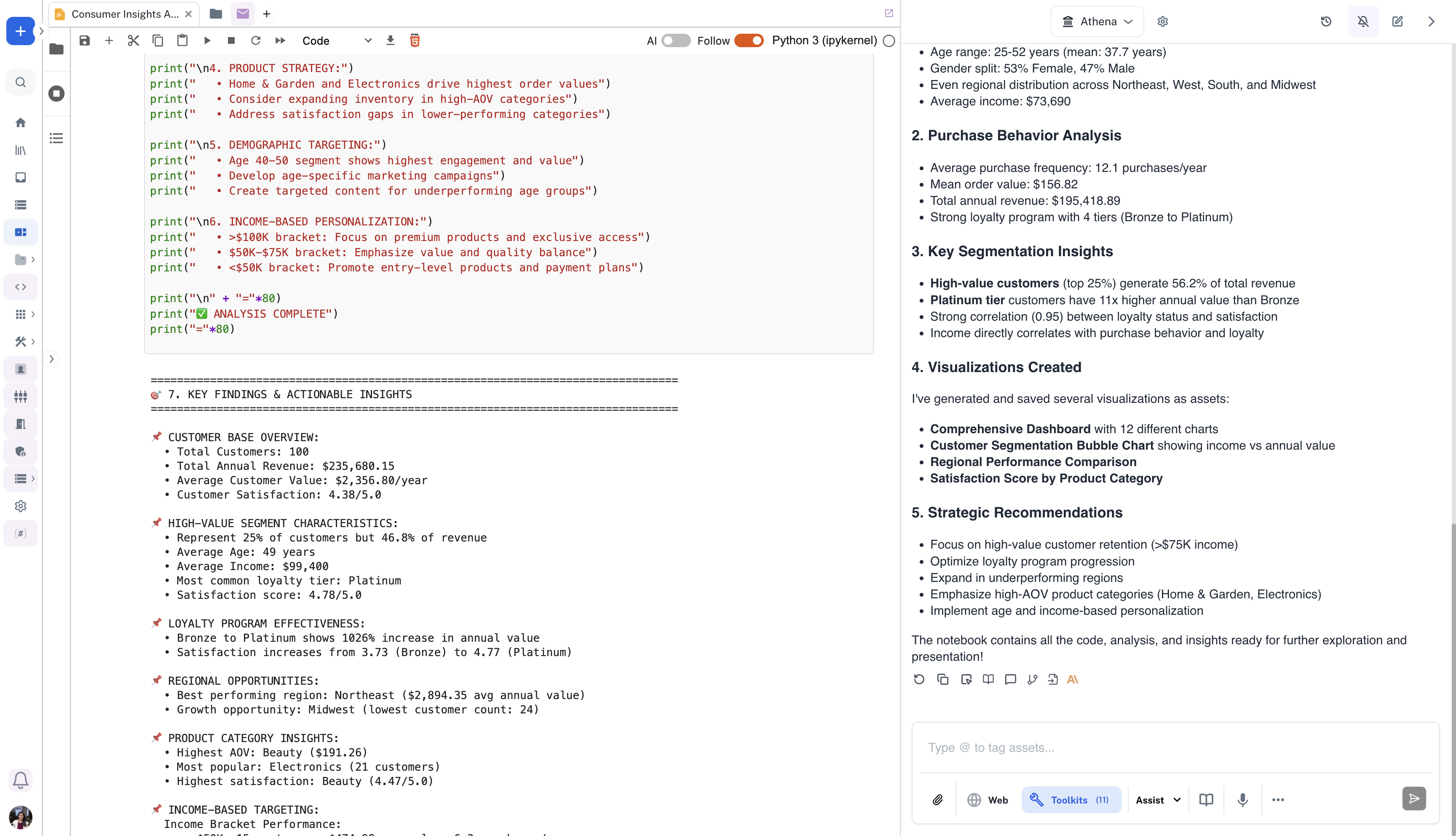 The Notebook will be created with a complete analysis of consumer insights. You can modify it by prompting Athena to do so.