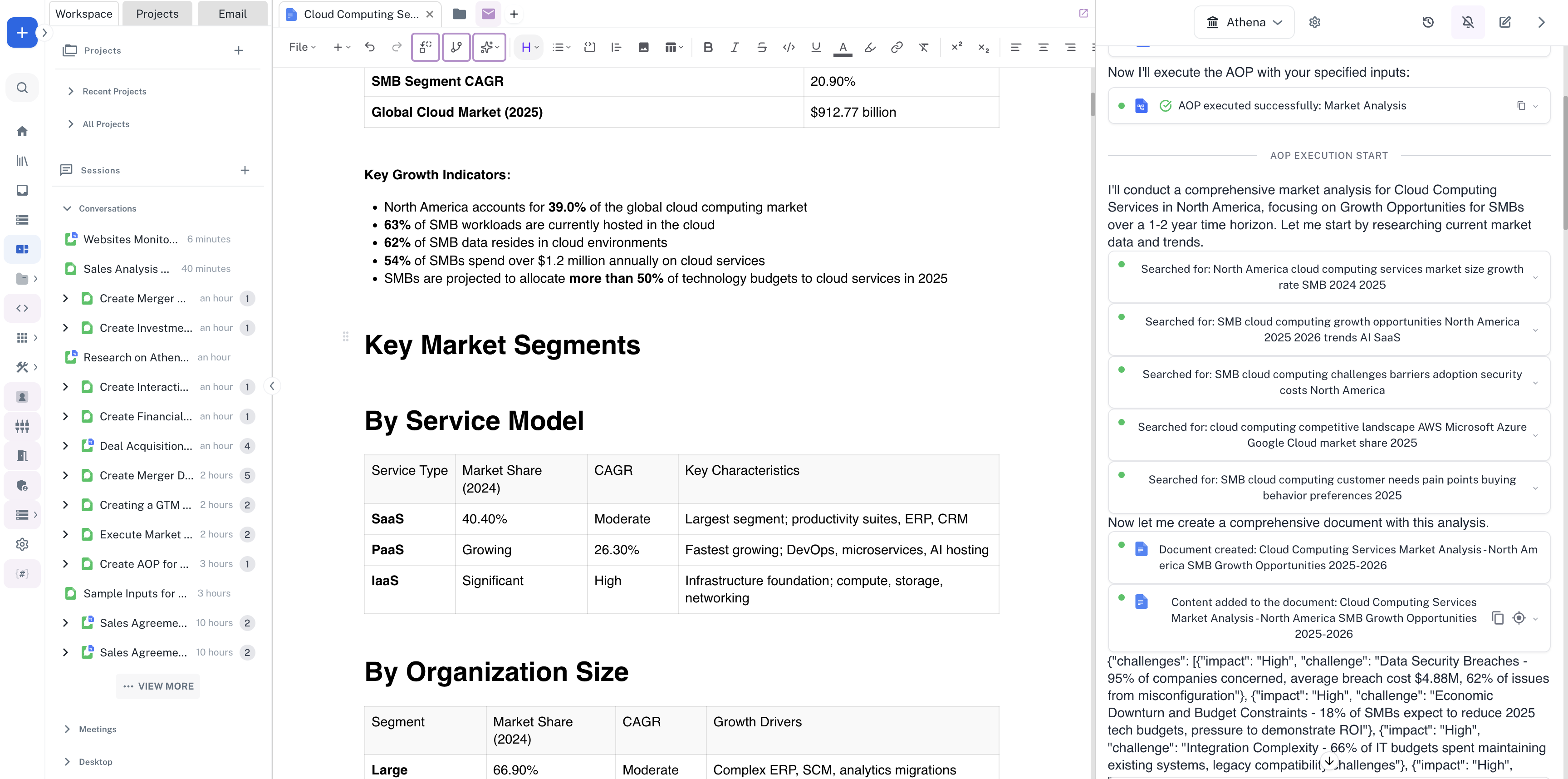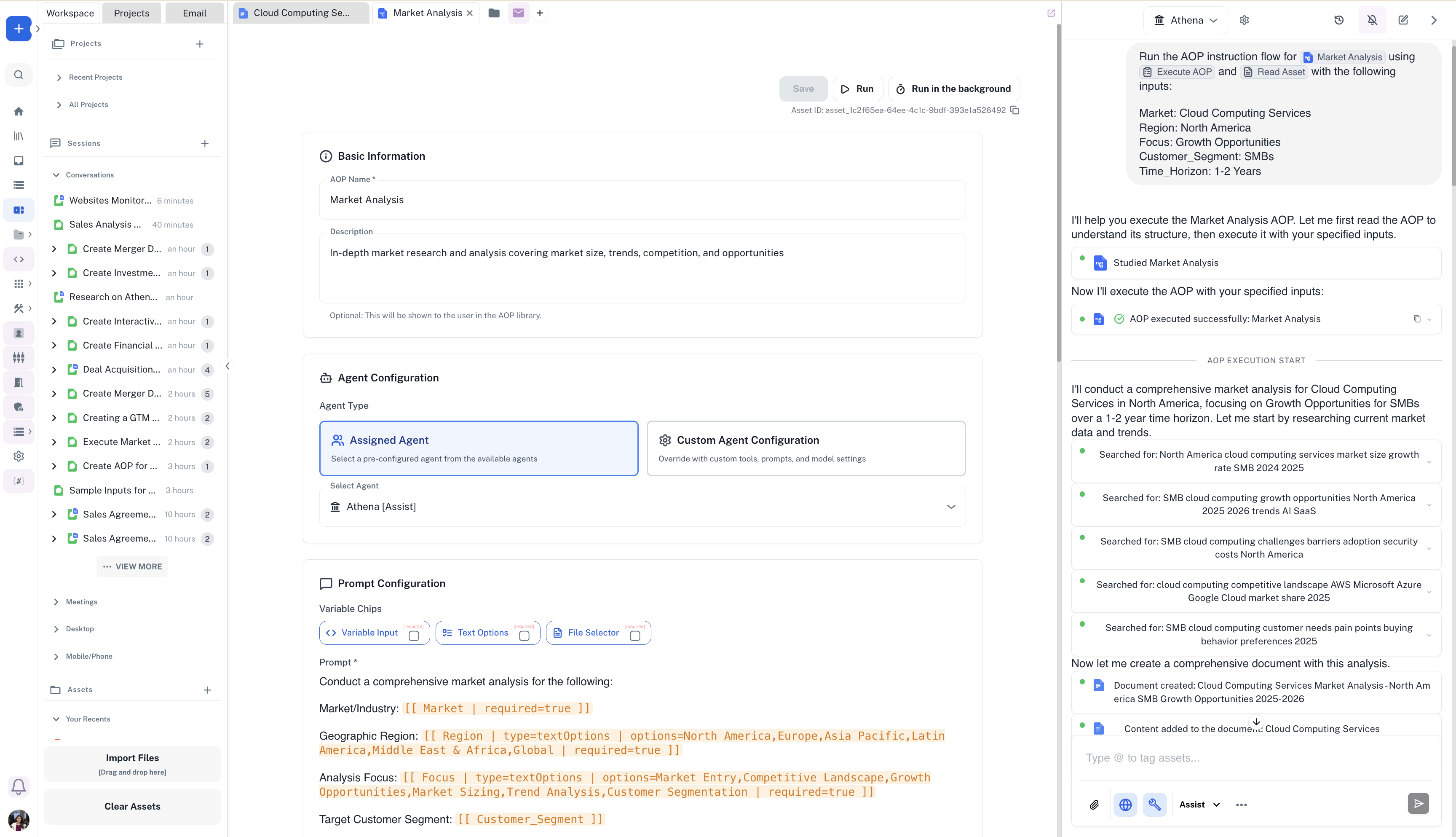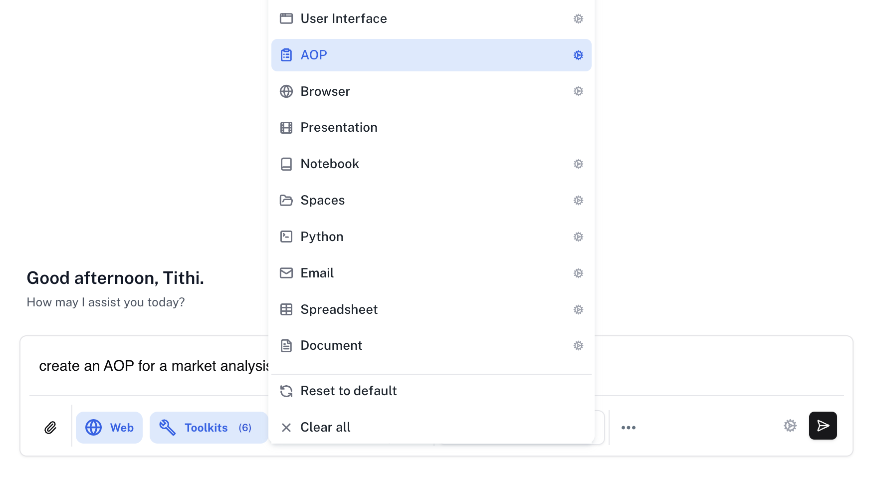Navigate to Spaces. In the Chat, enter a prompt to create an AOP for market analysis and press Enter.