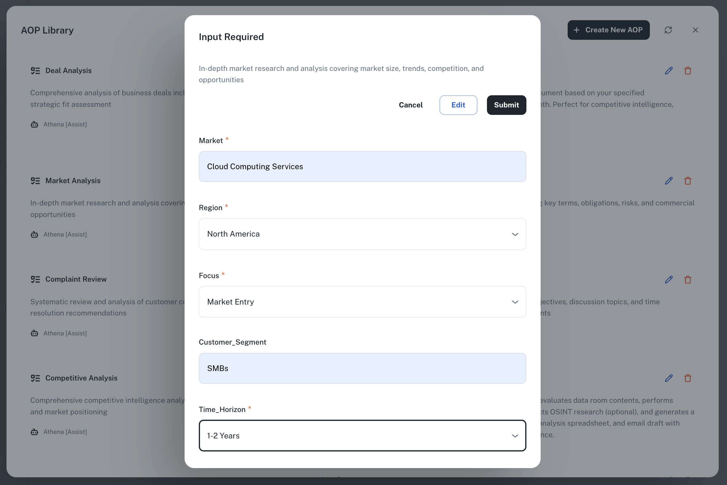 Once the AOP is created, run it by providing the necessary inputs such as market, region, focus, customer segment, and time horizon. Fill in the required fields and click Submit.