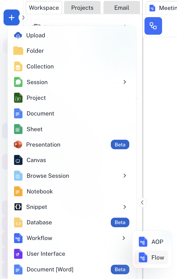 Go to Spaces. Click on the + -> Workflow -> Flow button on the top left and name your flow “Meeting Agenda Draft”.