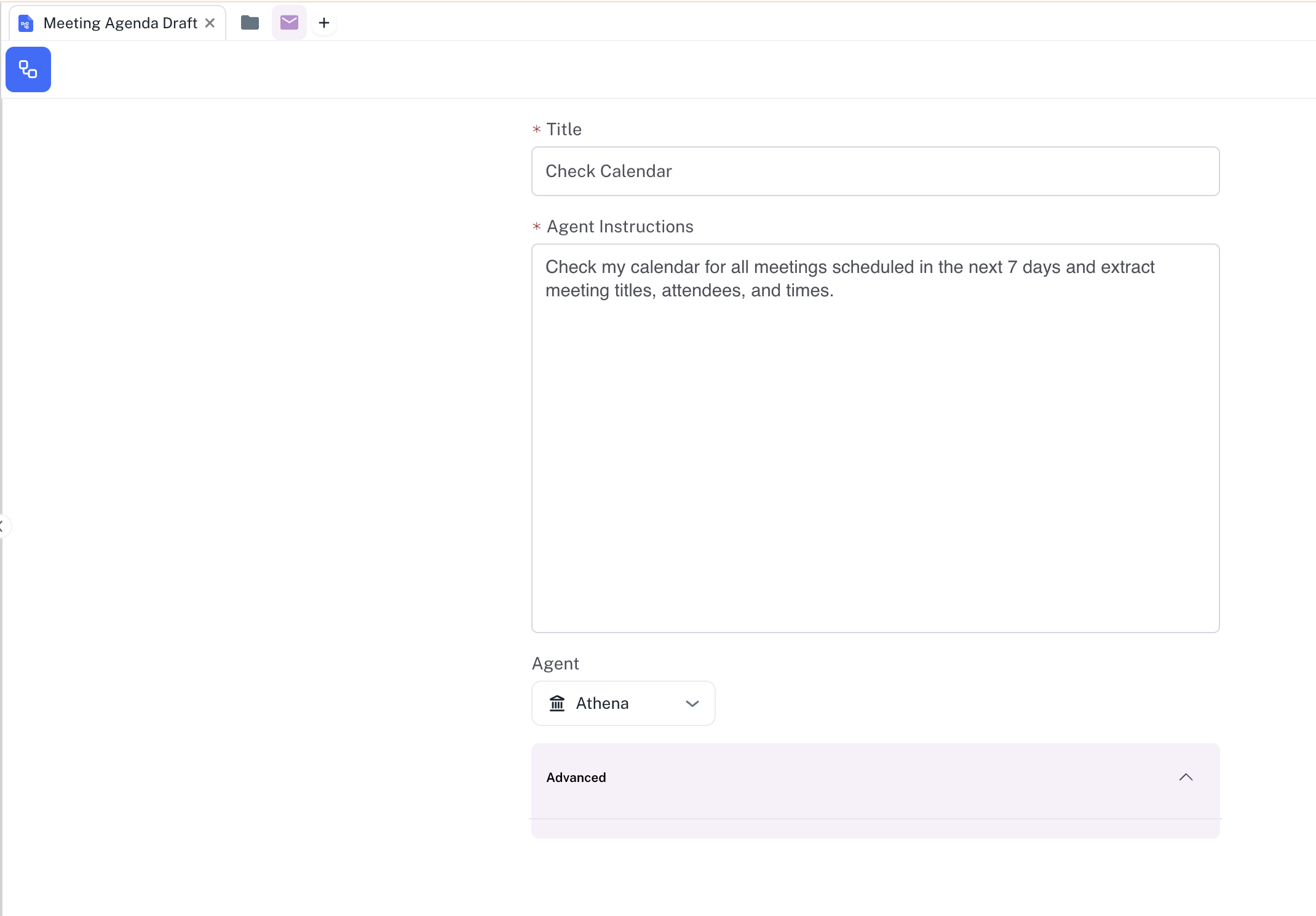 In the Title field, enter “Check Calendar” and in the Agent Instructions field, enter your prompt, for example the one given below: