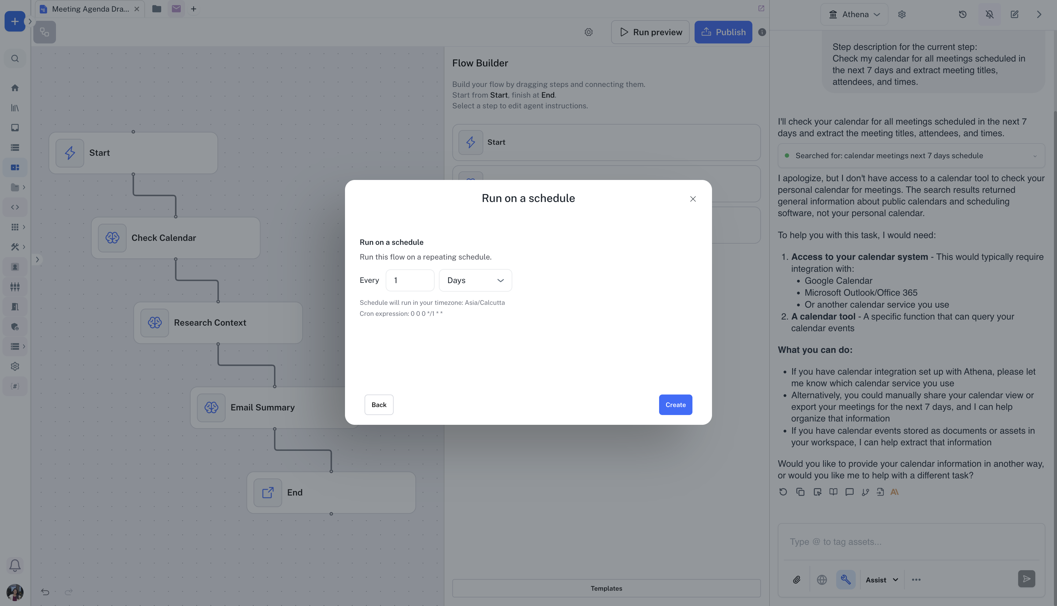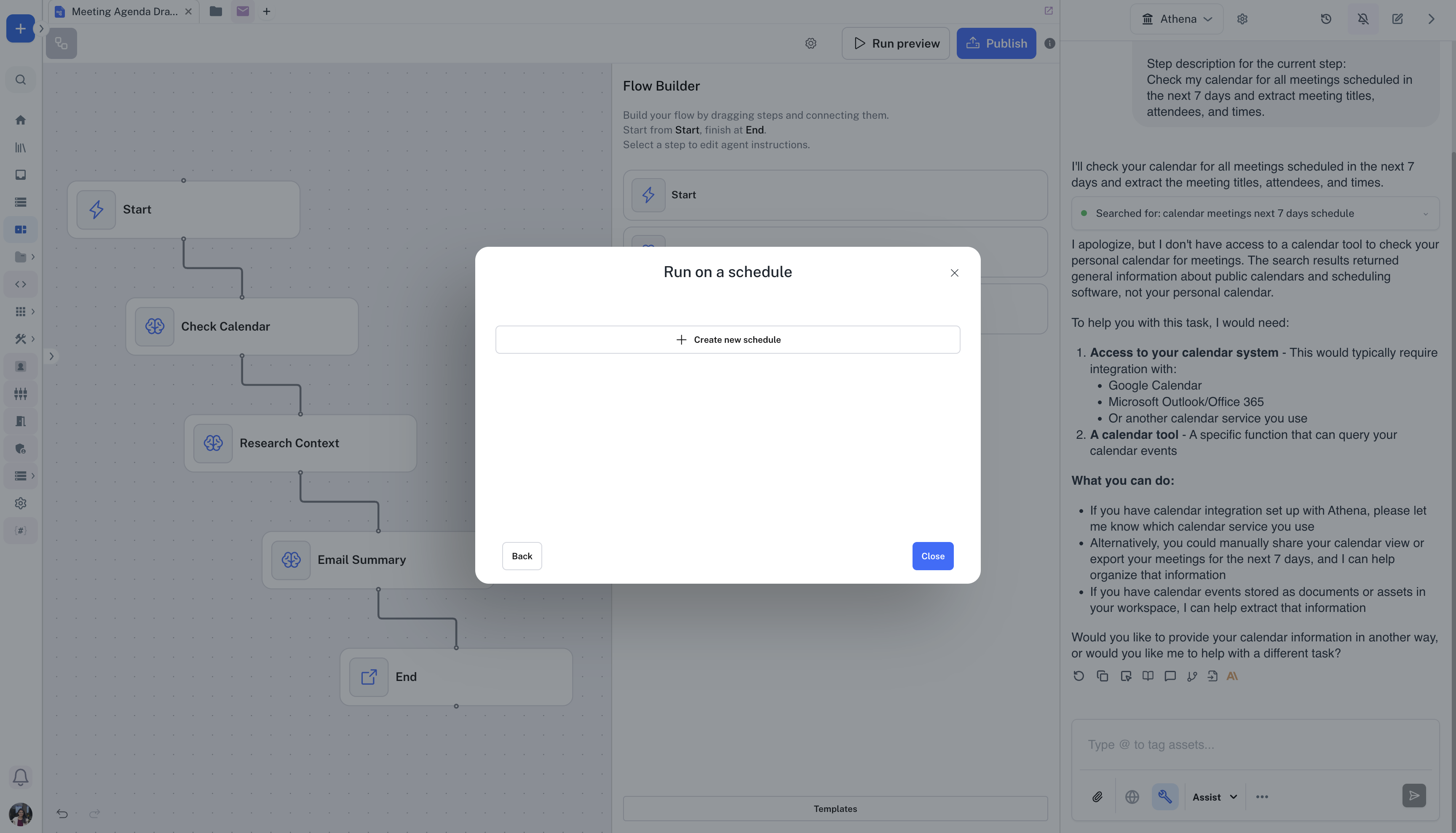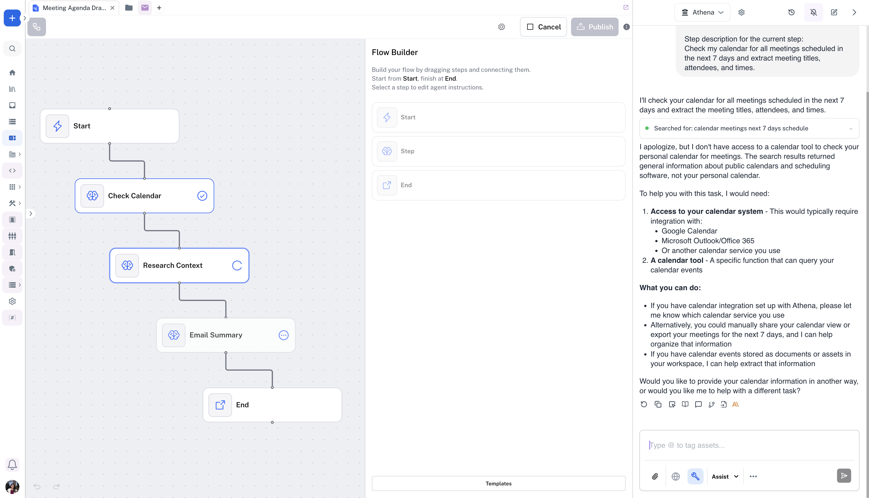 Similarly, add Step 3 “Send Email” to the Flow. You can add the following Agent Instructions: “Compile all meeting agendas into a single email and send it to me with the subject “Meeting Prep: [Date Range]” including attendee insights and suggested agenda items for each meeting.”