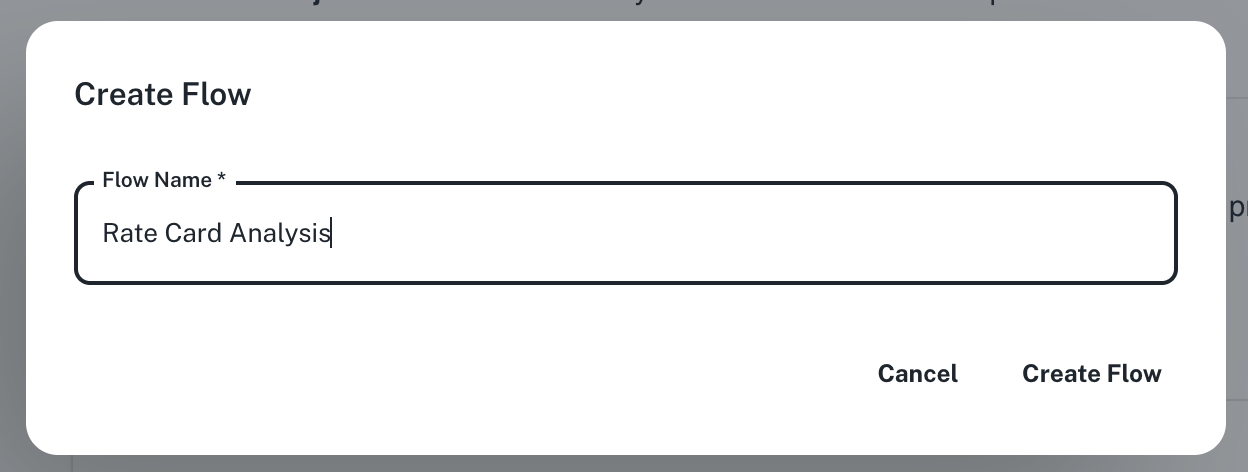 Go to Spaces. Click on the + -> Workflow -> Flow button on the top left and name your flow “Rate Card Analysis”.