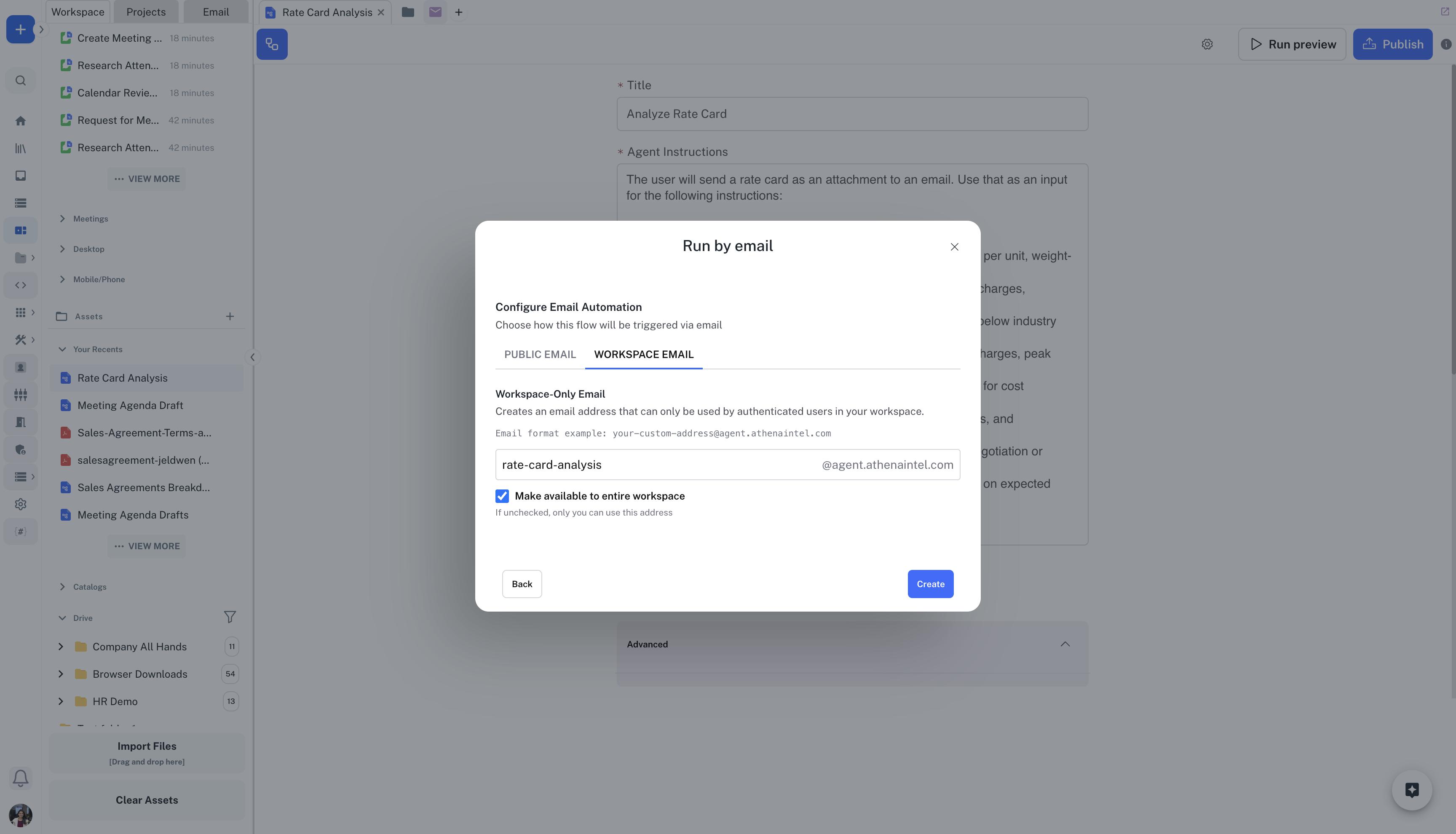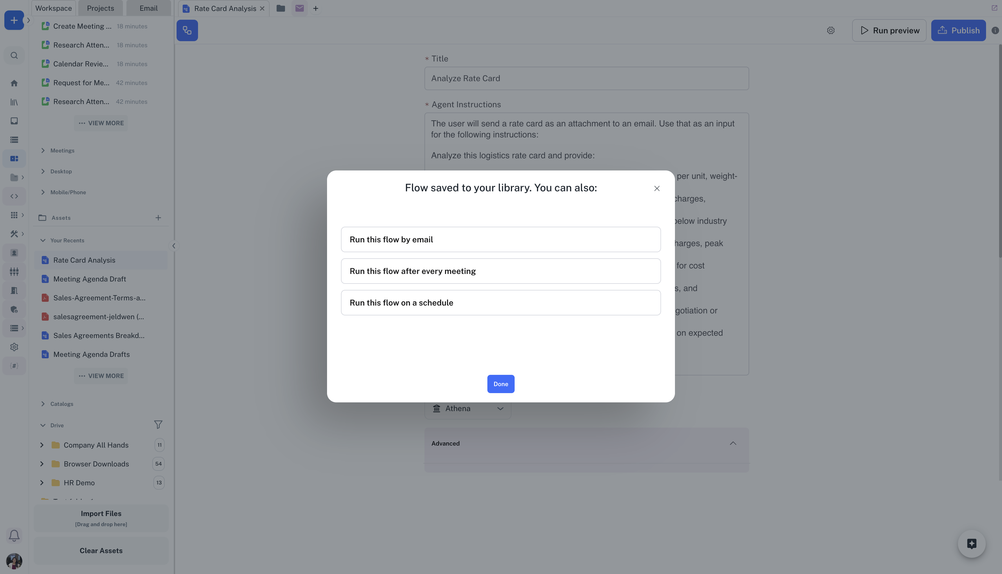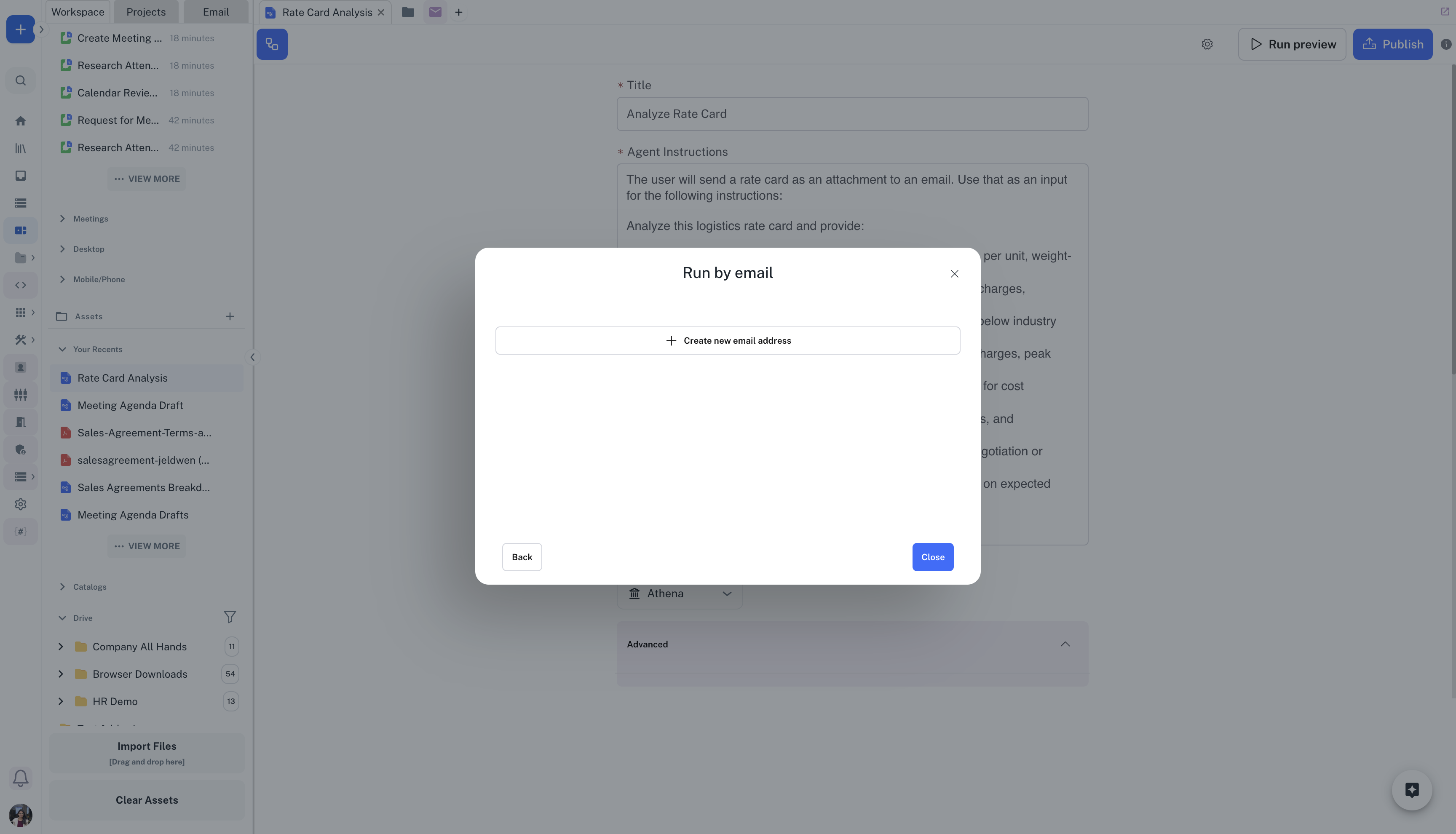 Athena can also send emails with files created during the workflow run as attachments to the response email.