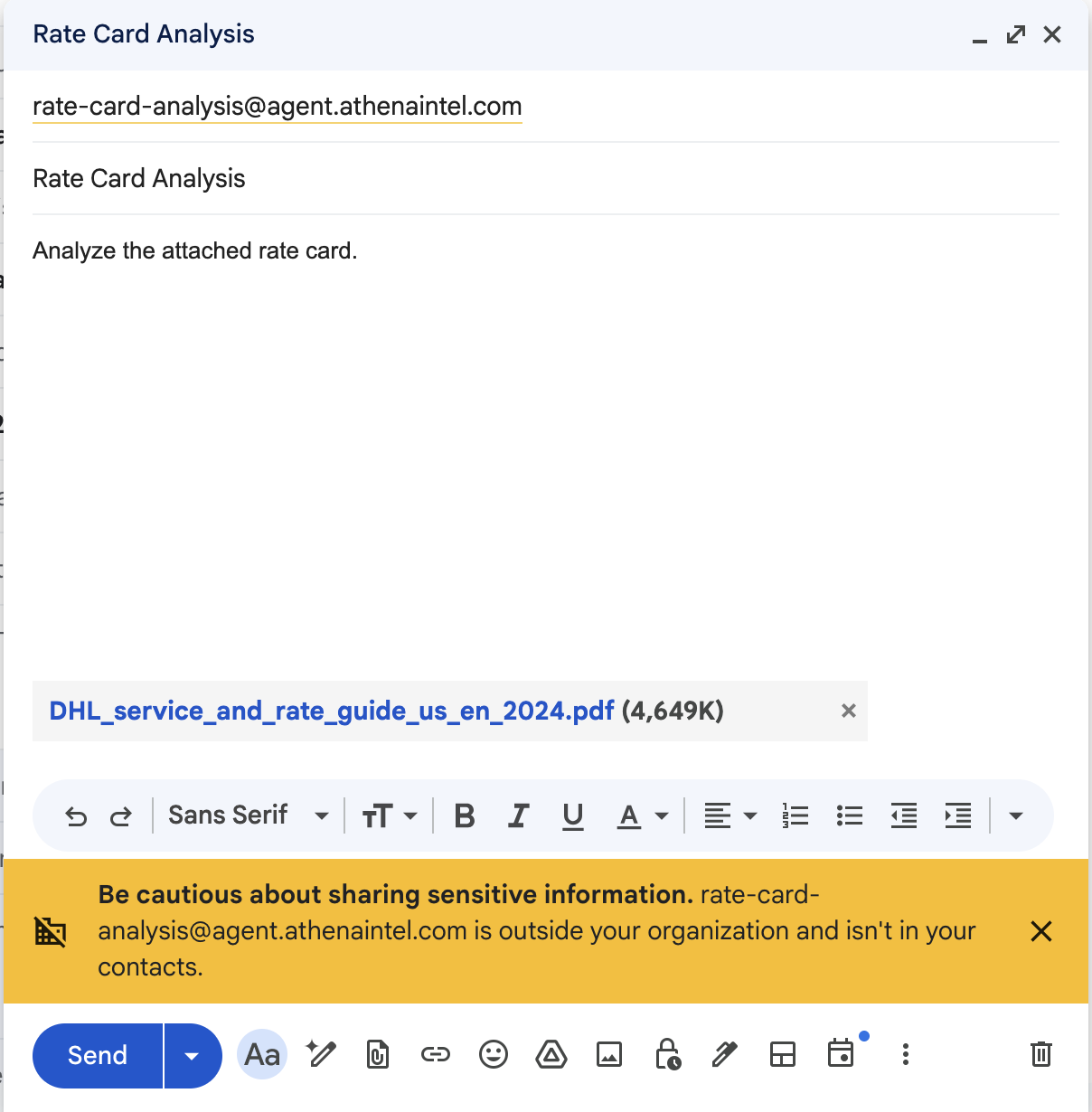 Send an email to [email protected] with the rate card to be analyzed as an attachment. Once Athena completes processing the rate card, it will reply to your email with the results.